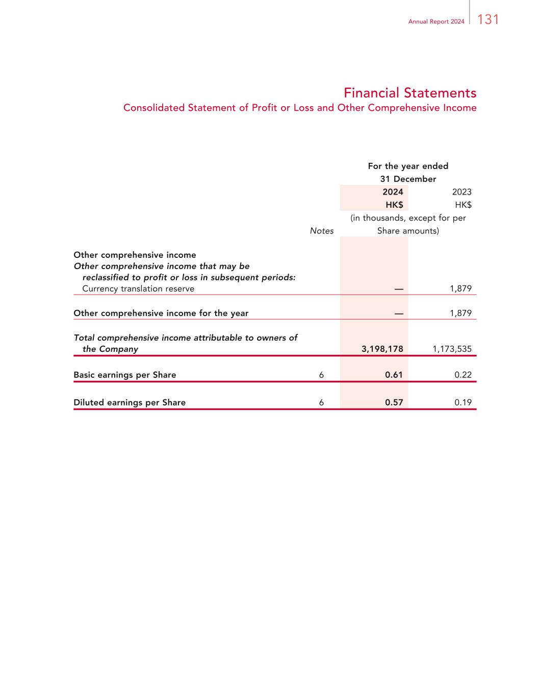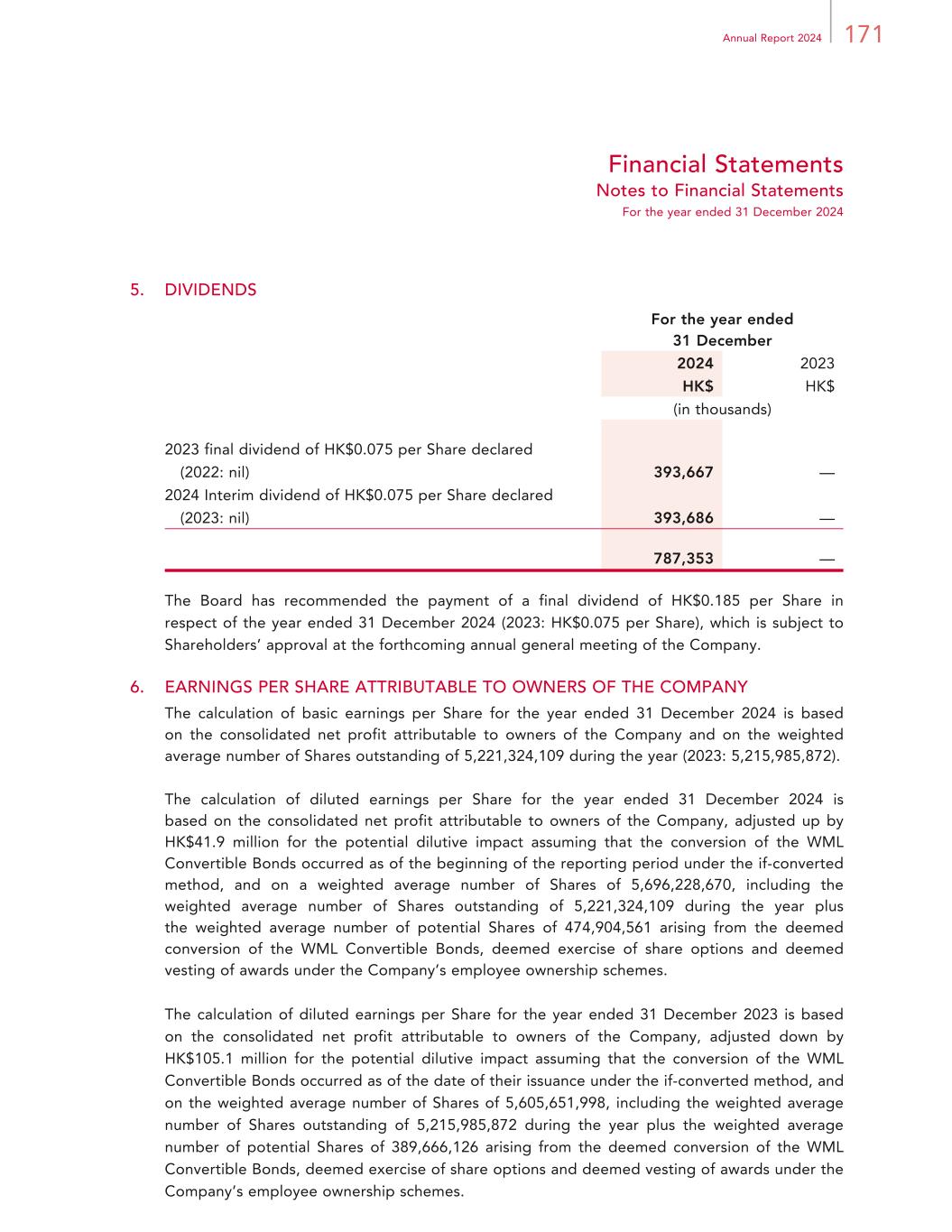 171Annual Report 2024 Financial Statements Notes to Financial Statements For the year ended 31 December 2024 5. DIVIDENDS For the year ended 31 December 2024 2023 HK$ HK$ (in thousands) 2023 final dividend of HK$0.075 per Share declared (2022: nil) 393,667 — 2024 Interim dividend of HK$0.075 per Share declared (2023: nil) 393,686 — 787,353 — The Board has recommended the payment of a final dividend of HK$0.185 per Share in respect of the year ended 31 December 2024 (2023: HK$0.075 per Share), which is subject to Shareholders’ approval at the forthcoming annual general meeting of the Company. 6. EARNINGS PER SHARE ATTRIBUTABLE TO OWNERS OF THE COMPANY The calculation of basic earnings per Share for the year ended 31 December 2024 is based on the consolidated net profit attributable to owners of the Company and on the weighted average number of Shares outstanding of 5,221,324,109 during the year (2023: 5,215,985,872). The calculation of diluted earnings per Share for the year ended 31 December 2024 is based on the consolidated net profit attributable to owners of the Company, adjusted up by HK$41.9 million for the potential dilutive impact assuming that the conversion of the WML Convertible Bonds occurred as of the beginning of the reporting period under the if-converted method, and on a weighted average number of Shares of 5,696,228,670, including the weighted average number of Shares outstanding of 5,221,324,109 during the year plus the weighted average number of potential Shares of 474,904,561 arising from the deemed conversion of the WML Convertible Bonds, deemed exercise of share options and deemed vesting of awards under the Company’s employee ownership schemes. The calculation of diluted earnings per Share for the year ended 31 December 2023 is based on the consolidated net profit attributable to owners of the Company, adjusted down by HK$105.1 million for the potential dilutive impact assuming that the conversion of the WML Convertible Bonds occurred as of the date of their issuance under the if-converted method, and on the weighted average number of Shares of 5,605,651,998, including the weighted average number of Shares outstanding of 5,215,985,872 during the year plus the weighted average number of potential Shares of 389,666,126 arising from the deemed conversion of the WML Convertible Bonds, deemed exercise of share options and deemed vesting of awards under the Company’s employee ownership schemes.