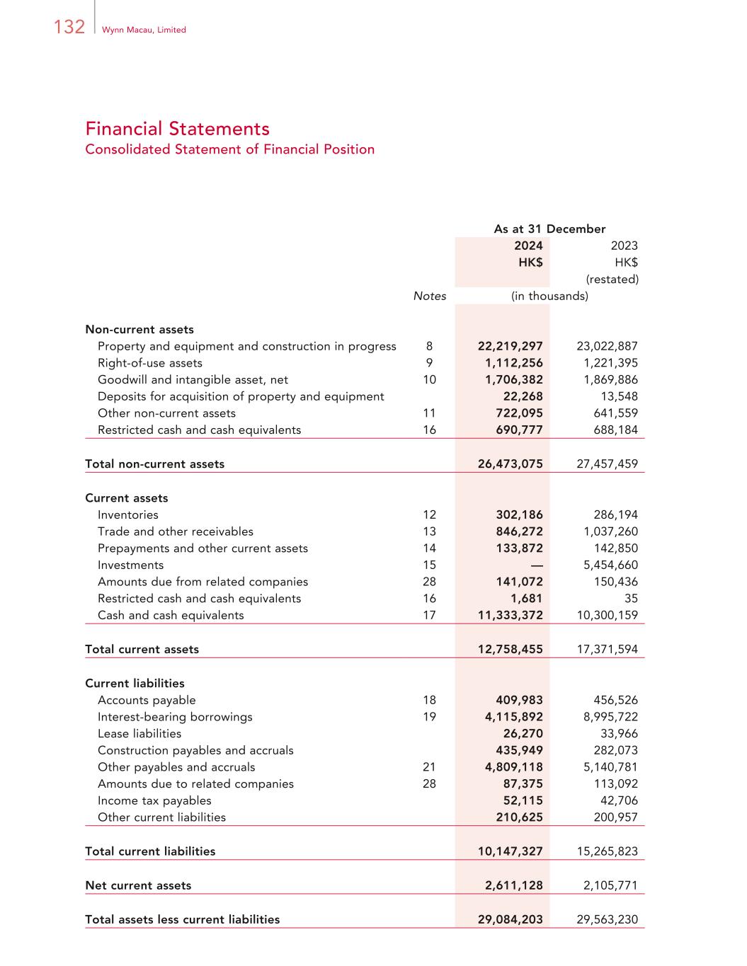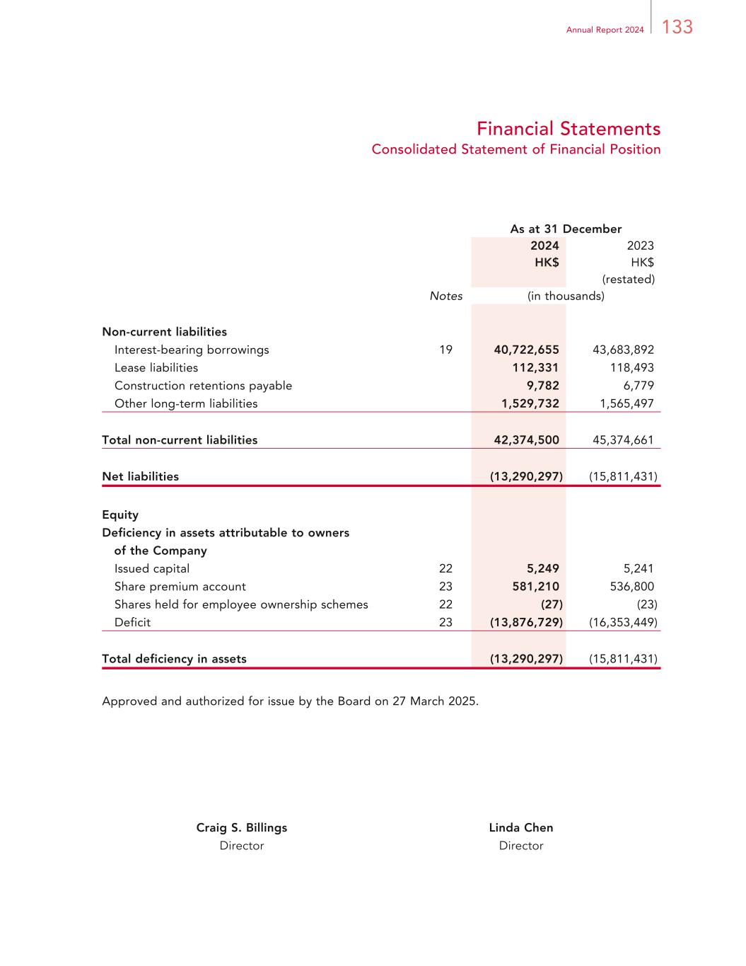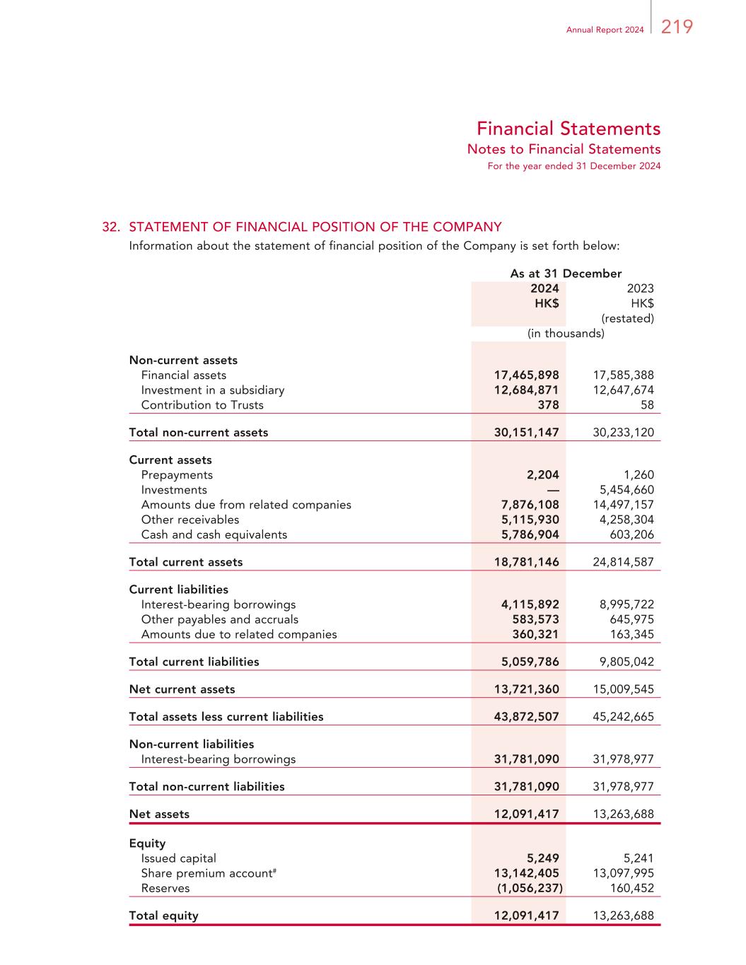 219Annual Report 2024 Financial Statements Notes to Financial Statements For the year ended 31 December 2024 32. STATEMENT OF FINANCIAL POSITION OF THE COMPANY Information about the statement of financial position of the Company is set forth below: As at 31 December 2024 2023 HK$ HK$ (restated) (in thousands) Non-current assets Financial assets 17,465,898 17,585,388 Investment in a subsidiary 12,684,871 12,647,674 Contribution to Trusts 378 58 Total non-current assets 30,151,147 30,233,120 Current assets Prepayments 2,204 1,260 Investments — 5,454,660 Amounts due from related companies 7,876,108 14,497,157 Other receivables 5,115,930 4,258,304 Cash and cash equivalents 5,786,904 603,206 Total current assets 18,781,146 24,814,587 Current liabilities Interest-bearing borrowings 4,115,892 8,995,722 Other payables and accruals 583,573 645,975 Amounts due to related companies 360,321 163,345 Total current liabilities 5,059,786 9,805,042 Net current assets 13,721,360 15,009,545 Total assets less current liabilities 43,872,507 45,242,665 Non-current liabilities Interest-bearing borrowings 31,781,090 31,978,977 Total non-current liabilities 31,781,090 31,978,977 Net assets 12,091,417 13,263,688 Equity Issued capital 5,249 5,241 Share premium account# 13,142,405 13,097,995 Reserves (1,056,237) 160,452 Total equity 12,091,417 13,263,688