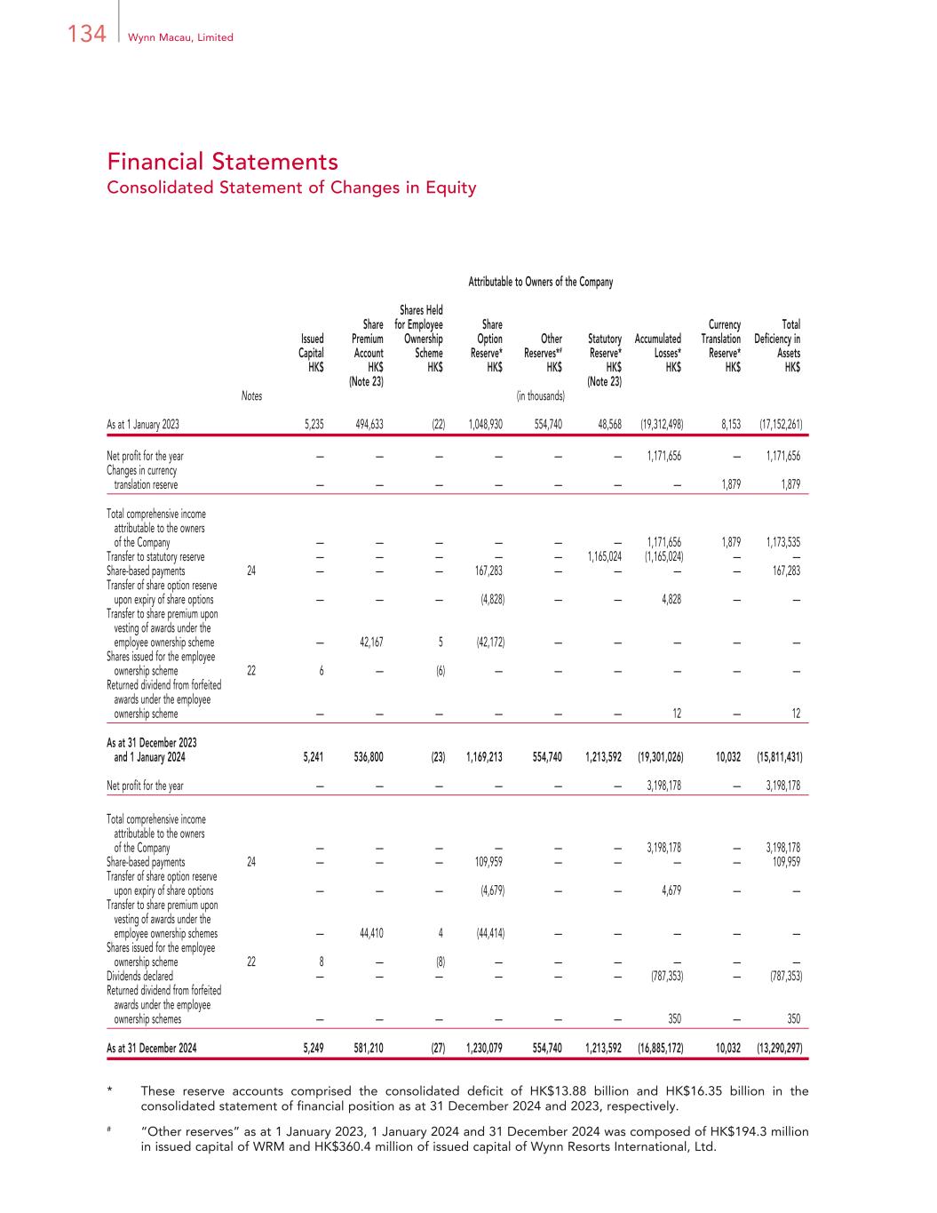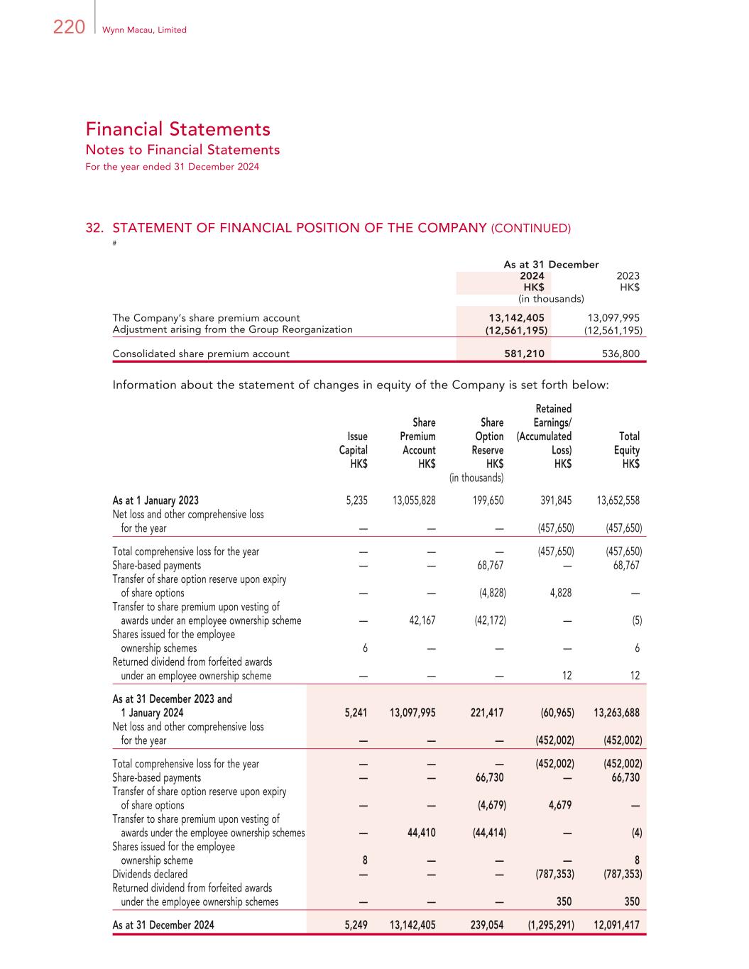 220 Wynn Macau, Limited Financial Statements Notes to Financial Statements For the year ended 31 December 2024 32. STATEMENT OF FINANCIAL POSITION OF THE COMPANY (CONTINUED) # As at 31 December 2024 2023 HK$ HK$ (in thousands) The Company’s share premium account 13,142,405 13,097,995 Adjustment arising from the Group Reorganization (12,561,195) (12,561,195) Consolidated share premium account 581,210 536,800 Information about the statement of changes in equity of the Company is set forth below: Issue Capital Share Premium Account Share Option Reserve Retained Earnings/ (Accumulated Loss) Total Equity HK$ HK$ HK$ HK$ HK$ (in thousands) As at 1 January 2023 5,235 13,055,828 199,650 391,845 13,652,558 Net loss and other comprehensive loss for the year — — — (457,650) (457,650) Total comprehensive loss for the year — — — (457,650) (457,650) Share-based payments — — 68,767 — 68,767 Transfer of share option reserve upon expiry of share options — — (4,828) 4,828 — Transfer to share premium upon vesting of awards under an employee ownership scheme — 42,167 (42,172) — (5) Shares issued for the employee ownership schemes 6 — — — 6 Returned dividend from forfeited awards under an employee ownership scheme — — — 12 12 As at 31 December 2023 and 1 January 2024 5,241 13,097,995 221,417 (60,965) 13,263,688 Net loss and other comprehensive loss for the year — — — (452,002) (452,002) Total comprehensive loss for the year — — — (452,002) (452,002) Share-based payments — — 66,730 — 66,730 Transfer of share option reserve upon expiry of share options — — (4,679) 4,679 — Transfer to share premium upon vesting of awards under the employee ownership schemes — 44,410 (44,414) — (4) Shares issued for the employee ownership scheme 8 — — — 8 Dividends declared — — — (787,353) (787,353) Returned dividend from forfeited awards under the employee ownership schemes — — — 350 350 As at 31 December 2024 5,249 13,142,405 239,054 (1,295,291) 12,091,417