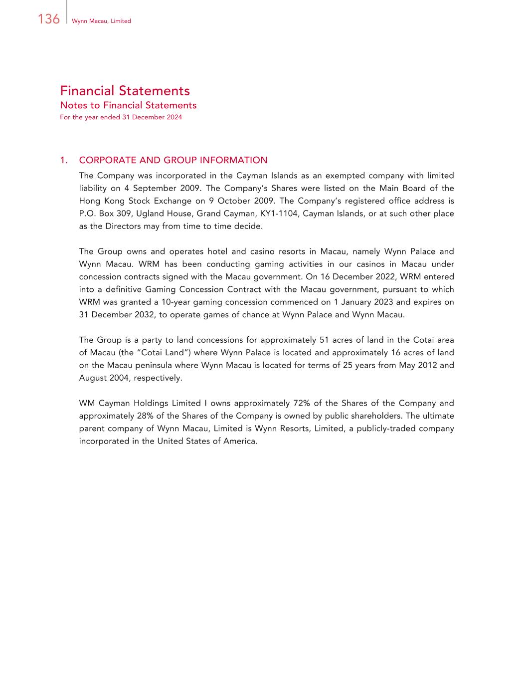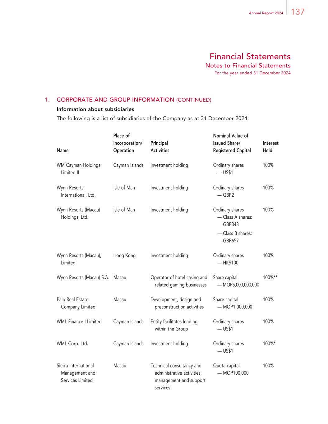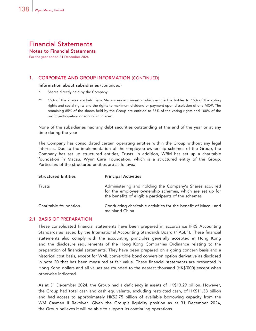 138 Wynn Macau, Limited Financial Statements Notes to Financial Statements For the year ended 31 December 2024 1. CORPORATE AND GROUP INFORMATION (CONTINUED) Information about subsidiaries (continued) * Shares directly held by the Company ** 15% of the shares are held by a Macau-resident investor which entitle the holder to 15% of the voting rights and social rights and the rights to maximum dividend or payment upon dissolution of one MOP. The remaining 85% of the shares held by the Group are entitled to 85% of the voting rights and 100% of the profit participation or economic interest. None of the subsidiaries had any debt securities outstanding at the end of the year or at any time during the year. The Company has consolidated certain operating entities within the Group without any legal interests. Due to the implementation of the employee ownership schemes of the Group, the Company has set up structured entities, Trusts. In addition, WRM has set up a charitable foundation in Macau, Wynn Care Foundation, which is a structured entity of the Group. Particulars of the structured entities are as follows: Structured Entities Principal Activities Trusts Administering and holding the Company’s Shares acquired for the employee ownership schemes, which are set up for the benefits of eligible participants of the schemes Charitable foundation Conducting charitable activities for the benefit of Macau and mainland China 2.1 BASIS OF PREPARATION These consolidated financial statements have been prepared in accordance IFRS Accounting Standards as issued by the International Accounting Standards Board (“IASB”). These financial statements also comply with the accounting principles generally accepted in Hong Kong and the disclosure requirements of the Hong Kong Companies Ordinance relating to the preparation of financial statements. They have been prepared on a going concern basis and a historical cost basis, except for WML convertible bond conversion option derivative as disclosed in note 20 that has been measured at fair value. These financial statements are presented in Hong Kong dollars and all values are rounded to the nearest thousand (HK$’000) except when otherwise indicated. As at 31 December 2024, the Group had a deficiency in assets of HK$13.29 billion. However, the Group had total cash and cash equivalents, excluding restricted cash, of HK$11.33 billion and had access to approximately HK$2.75 billion of available borrowing capacity from the WM Cayman II Revolver. Given the Group’s liquidity position as at 31 December 2024, the Group believes it will be able to support its continuing operations.