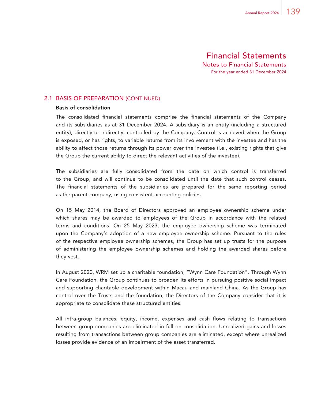 139Annual Report 2024 Financial Statements Notes to Financial Statements For the year ended 31 December 2024 2.1 BASIS OF PREPARATION (CONTINUED) Basis of consolidation The consolidated financial statements comprise the financial statements of the Company and its subsidiaries as at 31 December 2024. A subsidiary is an entity (including a structured entity), directly or indirectly, controlled by the Company. Control is achieved when the Group is exposed, or has rights, to variable returns from its involvement with the investee and has the ability to affect those returns through its power over the investee (i.e., existing rights that give the Group the current ability to direct the relevant activities of the investee). The subsidiaries are fully consolidated from the date on which control is transferred to the Group, and will continue to be consolidated until the date that such control ceases. The financial statements of the subsidiaries are prepared for the same reporting period as the parent company, using consistent accounting policies. On 15 May 2014, the Board of Directors approved an employee ownership scheme under which shares may be awarded to employees of the Group in accordance with the related terms and conditions. On 25 May 2023, the employee ownership scheme was terminated upon the Company’s adoption of a new employee ownership scheme. Pursuant to the rules of the respective employee ownership schemes, the Group has set up trusts for the purpose of administering the employee ownership schemes and holding the awarded shares before they vest. In August 2020, WRM set up a charitable foundation, “Wynn Care Foundation”. Through Wynn Care Foundation, the Group continues to broaden its efforts in pursuing positive social impact and supporting charitable development within Macau and mainland China. As the Group has control over the Trusts and the foundation, the Directors of the Company consider that it is appropriate to consolidate these structured entities. All intra-group balances, equity, income, expenses and cash flows relating to transactions between group companies are eliminated in full on consolidation. Unrealized gains and losses resulting from transactions between group companies are eliminated, except where unrealized losses provide evidence of an impairment of the asset transferred.