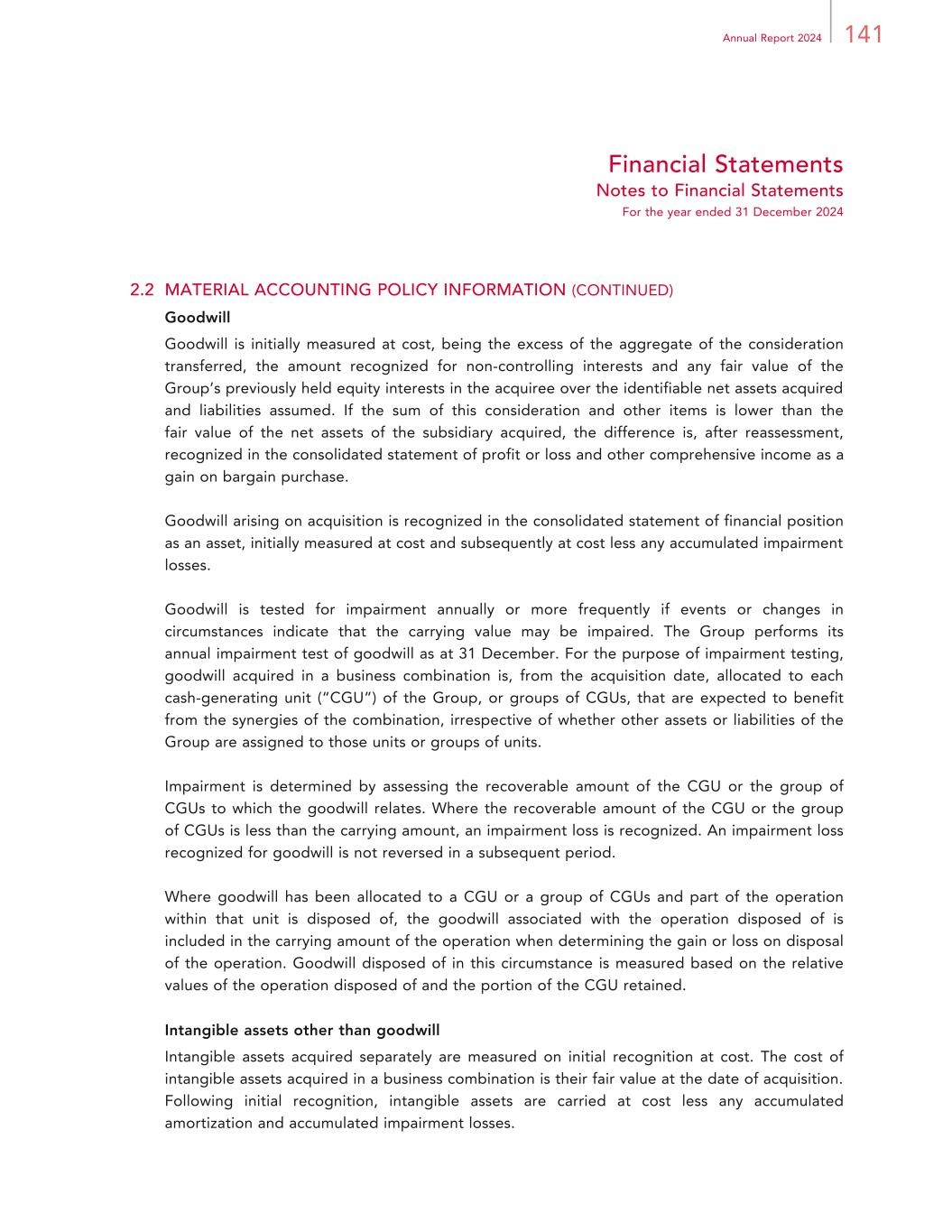 141Annual Report 2024 Financial Statements Notes to Financial Statements For the year ended 31 December 2024 2.2 MATERIAL ACCOUNTING POLICY INFORMATION (CONTINUED) Goodwill Goodwill is initially measured at cost, being the excess of the aggregate of the consideration transferred, the amount recognized for non-controlling interests and any fair value of the Group’s previously held equity interests in the acquiree over the identifiable net assets acquired and liabilities assumed. If the sum of this consideration and other items is lower than the fair value of the net assets of the subsidiary acquired, the difference is, after reassessment, recognized in the consolidated statement of profit or loss and other comprehensive income as a gain on bargain purchase. Goodwill arising on acquisition is recognized in the consolidated statement of financial position as an asset, initially measured at cost and subsequently at cost less any accumulated impairment losses. Goodwill is tested for impairment annually or more frequently if events or changes in circumstances indicate that the carrying value may be impaired. The Group performs its annual impairment test of goodwill as at 31 December. For the purpose of impairment testing, goodwill acquired in a business combination is, from the acquisition date, allocated to each cash-generating unit (“CGU”) of the Group, or groups of CGUs, that are expected to benefit from the synergies of the combination, irrespective of whether other assets or liabilities of the Group are assigned to those units or groups of units. Impairment is determined by assessing the recoverable amount of the CGU or the group of CGUs to which the goodwill relates. Where the recoverable amount of the CGU or the group of CGUs is less than the carrying amount, an impairment loss is recognized. An impairment loss recognized for goodwill is not reversed in a subsequent period. Where goodwill has been allocated to a CGU or a group of CGUs and part of the operation within that unit is disposed of, the goodwill associated with the operation disposed of is included in the carrying amount of the operation when determining the gain or loss on disposal of the operation. Goodwill disposed of in this circumstance is measured based on the relative values of the operation disposed of and the portion of the CGU retained. Intangible assets other than goodwill Intangible assets acquired separately are measured on initial recognition at cost. The cost of intangible assets acquired in a business combination is their fair value at the date of acquisition. Following initial recognition, intangible assets are carried at cost less any accumulated amortization and accumulated impairment losses.