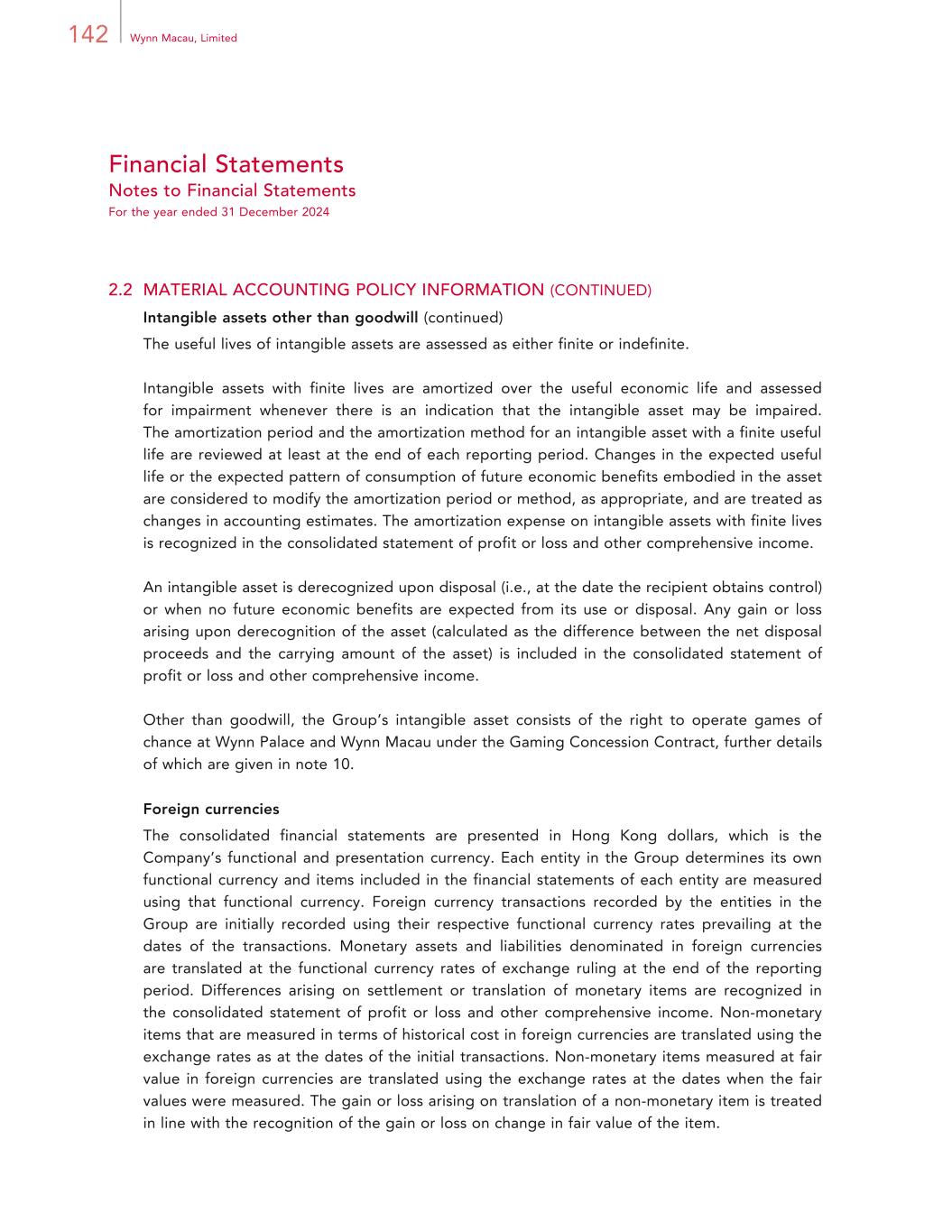 142 Wynn Macau, Limited Financial Statements Notes to Financial Statements For the year ended 31 December 2024 2.2 MATERIAL ACCOUNTING POLICY INFORMATION (CONTINUED) Intangible assets other than goodwill (continued) The useful lives of intangible assets are assessed as either finite or indefinite. Intangible assets with finite lives are amortized over the useful economic life and assessed for impairment whenever there is an indication that the intangible asset may be impaired. The amortization period and the amortization method for an intangible asset with a finite useful life are reviewed at least at the end of each reporting period. Changes in the expected useful life or the expected pattern of consumption of future economic benefits embodied in the asset are considered to modify the amortization period or method, as appropriate, and are treated as changes in accounting estimates. The amortization expense on intangible assets with finite lives is recognized in the consolidated statement of profit or loss and other comprehensive income. An intangible asset is derecognized upon disposal (i.e., at the date the recipient obtains control) or when no future economic benefits are expected from its use or disposal. Any gain or loss arising upon derecognition of the asset (calculated as the difference between the net disposal proceeds and the carrying amount of the asset) is included in the consolidated statement of profit or loss and other comprehensive income. Other than goodwill, the Group’s intangible asset consists of the right to operate games of chance at Wynn Palace and Wynn Macau under the Gaming Concession Contract, further details of which are given in note 10. Foreign currencies The consolidated financial statements are presented in Hong Kong dollars, which is the Company’s functional and presentation currency. Each entity in the Group determines its own functional currency and items included in the financial statements of each entity are measured using that functional currency. Foreign currency transactions recorded by the entities in the Group are initially recorded using their respective functional currency rates prevailing at the dates of the transactions. Monetary assets and liabilities denominated in foreign currencies are translated at the functional currency rates of exchange ruling at the end of the reporting period. Differences arising on settlement or translation of monetary items are recognized in the consolidated statement of profit or loss and other comprehensive income. Non-monetary items that are measured in terms of historical cost in foreign currencies are translated using the exchange rates as at the dates of the initial transactions. Non-monetary items measured at fair value in foreign currencies are translated using the exchange rates at the dates when the fair values were measured. The gain or loss arising on translation of a non-monetary item is treated in line with the recognition of the gain or loss on change in fair value of the item.