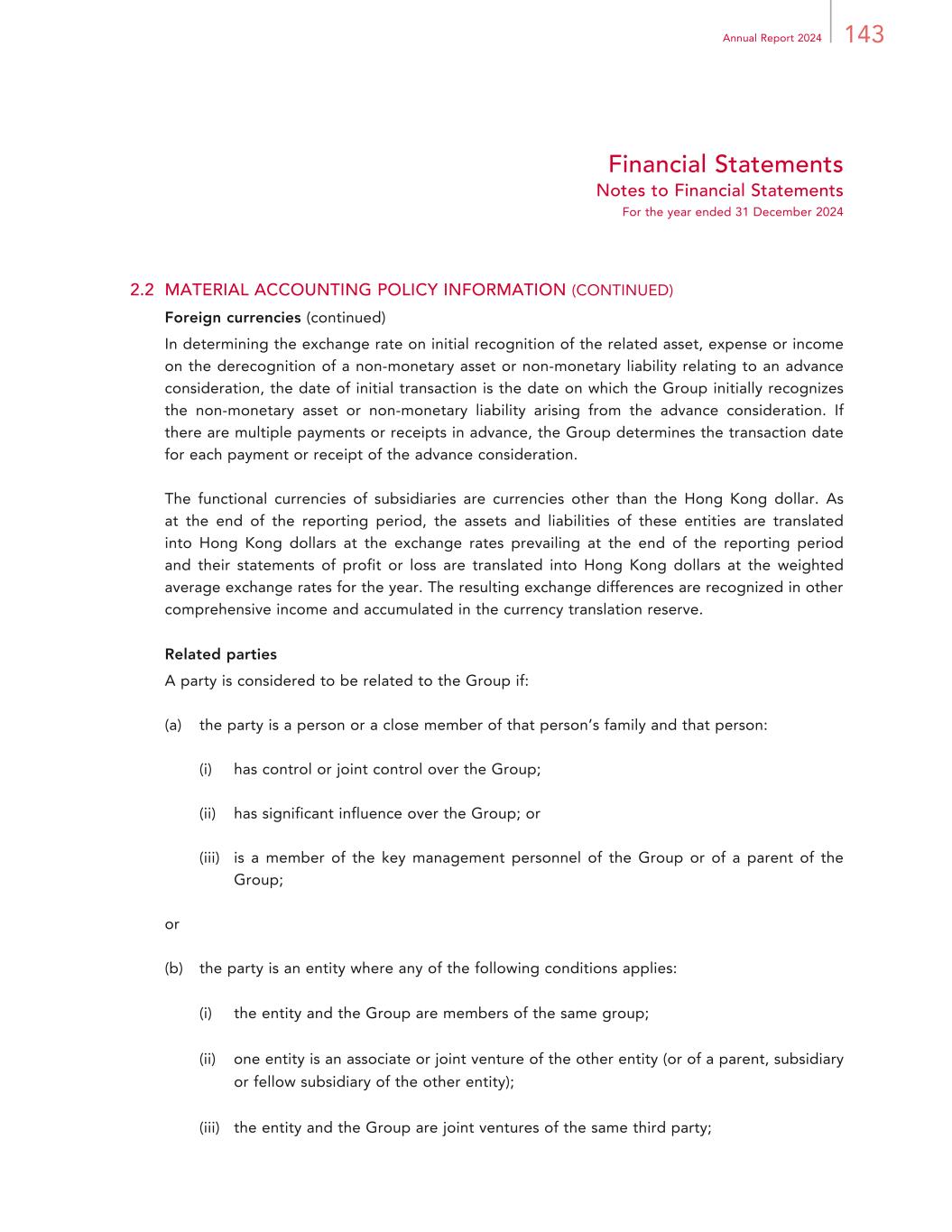 143Annual Report 2024 Financial Statements Notes to Financial Statements For the year ended 31 December 2024 2.2 MATERIAL ACCOUNTING POLICY INFORMATION (CONTINUED) Foreign currencies (continued) In determining the exchange rate on initial recognition of the related asset, expense or income on the derecognition of a non-monetary asset or non-monetary liability relating to an advance consideration, the date of initial transaction is the date on which the Group initially recognizes the non-monetary asset or non-monetary liability arising from the advance consideration. If there are multiple payments or receipts in advance, the Group determines the transaction date for each payment or receipt of the advance consideration. The functional currencies of subsidiaries are currencies other than the Hong Kong dollar. As at the end of the reporting period, the assets and liabilities of these entities are translated into Hong Kong dollars at the exchange rates prevailing at the end of the reporting period and their statements of profit or loss are translated into Hong Kong dollars at the weighted average exchange rates for the year. The resulting exchange differences are recognized in other comprehensive income and accumulated in the currency translation reserve. Related parties A party is considered to be related to the Group if: (a) the party is a person or a close member of that person’s family and that person: (i) has control or joint control over the Group; (ii) has significant influence over the Group; or (iii) is a member of the key management personnel of the Group or of a parent of the Group; or (b) the party is an entity where any of the following conditions applies: (i) the entity and the Group are members of the same group; (ii) one entity is an associate or joint venture of the other entity (or of a parent, subsidiary or fellow subsidiary of the other entity); (iii) the entity and the Group are joint ventures of the same third party;