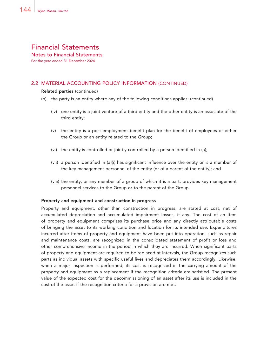 144 Wynn Macau, Limited Financial Statements Notes to Financial Statements For the year ended 31 December 2024 2.2 MATERIAL ACCOUNTING POLICY INFORMATION (CONTINUED) Related parties (continued) (b) the party is an entity where any of the following conditions applies: (continued) (iv) one entity is a joint venture of a third entity and the other entity is an associate of the third entity; (v) the entity is a post-employment benefit plan for the benefit of employees of either the Group or an entity related to the Group; (vi) the entity is controlled or jointly controlled by a person identified in (a); (vii) a person identified in (a)(i) has significant influence over the entity or is a member of the key management personnel of the entity (or of a parent of the entity); and (viii) the entity, or any member of a group of which it is a part, provides key management personnel services to the Group or to the parent of the Group. Property and equipment and construction in progress Property and equipment, other than construction in progress, are stated at cost, net of accumulated depreciation and accumulated impairment losses, if any. The cost of an item of property and equipment comprises its purchase price and any directly attributable costs of bringing the asset to its working condition and location for its intended use. Expenditures incurred after items of property and equipment have been put into operation, such as repair and maintenance costs, are recognized in the consolidated statement of profit or loss and other comprehensive income in the period in which they are incurred. When significant parts of property and equipment are required to be replaced at intervals, the Group recognizes such parts as individual assets with specific useful lives and depreciates them accordingly. Likewise, when a major inspection is performed, its cost is recognized in the carrying amount of the property and equipment as a replacement if the recognition criteria are satisfied. The present value of the expected cost for the decommissioning of an asset after its use is included in the cost of the asset if the recognition criteria for a provision are met.