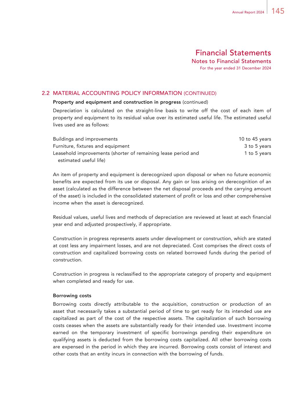 145Annual Report 2024 Financial Statements Notes to Financial Statements For the year ended 31 December 2024 2.2 MATERIAL ACCOUNTING POLICY INFORMATION (CONTINUED) Property and equipment and construction in progress (continued) Depreciation is calculated on the straight-line basis to write off the cost of each item of property and equipment to its residual value over its estimated useful life. The estimated useful lives used are as follows: Buildings and improvements 10 to 45 years Furniture, fixtures and equipment 3 to 5 years Leasehold improvements (shorter of remaining lease period and 1 to 5 years estimated useful life) An item of property and equipment is derecognized upon disposal or when no future economic benefits are expected from its use or disposal. Any gain or loss arising on derecognition of an asset (calculated as the difference between the net disposal proceeds and the carrying amount of the asset) is included in the consolidated statement of profit or loss and other comprehensive income when the asset is derecognized. Residual values, useful lives and methods of depreciation are reviewed at least at each financial year end and adjusted prospectively, if appropriate. Construction in progress represents assets under development or construction, which are stated at cost less any impairment losses, and are not depreciated. Cost comprises the direct costs of construction and capitalized borrowing costs on related borrowed funds during the period of construction. Construction in progress is reclassified to the appropriate category of property and equipment when completed and ready for use. Borrowing costs Borrowing costs directly attributable to the acquisition, construction or production of an asset that necessarily takes a substantial period of time to get ready for its intended use are capitalized as part of the cost of the respective assets. The capitalization of such borrowing costs ceases when the assets are substantially ready for their intended use. Investment income earned on the temporary investment of specific borrowings pending their expenditure on qualifying assets is deducted from the borrowing costs capitalized. All other borrowing costs are expensed in the period in which they are incurred. Borrowing costs consist of interest and other costs that an entity incurs in connection with the borrowing of funds.