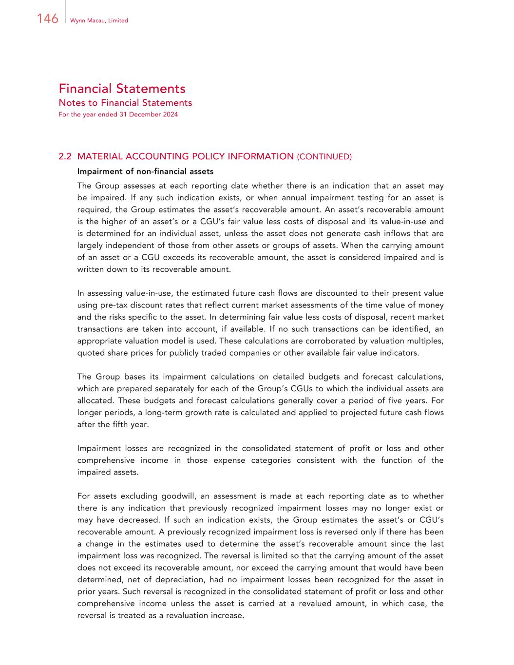 146 Wynn Macau, Limited Financial Statements Notes to Financial Statements For the year ended 31 December 2024 2.2 MATERIAL ACCOUNTING POLICY INFORMATION (CONTINUED) Impairment of non-financial assets The Group assesses at each reporting date whether there is an indication that an asset may be impaired. If any such indication exists, or when annual impairment testing for an asset is required, the Group estimates the asset’s recoverable amount. An asset’s recoverable amount is the higher of an asset’s or a CGU’s fair value less costs of disposal and its value-in-use and is determined for an individual asset, unless the asset does not generate cash inflows that are largely independent of those from other assets or groups of assets. When the carrying amount of an asset or a CGU exceeds its recoverable amount, the asset is considered impaired and is written down to its recoverable amount. In assessing value-in-use, the estimated future cash flows are discounted to their present value using pre-tax discount rates that reflect current market assessments of the time value of money and the risks specific to the asset. In determining fair value less costs of disposal, recent market transactions are taken into account, if available. If no such transactions can be identified, an appropriate valuation model is used. These calculations are corroborated by valuation multiples, quoted share prices for publicly traded companies or other available fair value indicators. The Group bases its impairment calculations on detailed budgets and forecast calculations, which are prepared separately for each of the Group’s CGUs to which the individual assets are allocated. These budgets and forecast calculations generally cover a period of five years. For longer periods, a long-term growth rate is calculated and applied to projected future cash flows after the fifth year. Impairment losses are recognized in the consolidated statement of profit or loss and other comprehensive income in those expense categories consistent with the function of the impaired assets. For assets excluding goodwill, an assessment is made at each reporting date as to whether there is any indication that previously recognized impairment losses may no longer exist or may have decreased. If such an indication exists, the Group estimates the asset’s or CGU’s recoverable amount. A previously recognized impairment loss is reversed only if there has been a change in the estimates used to determine the asset’s recoverable amount since the last impairment loss was recognized. The reversal is limited so that the carrying amount of the asset does not exceed its recoverable amount, nor exceed the carrying amount that would have been determined, net of depreciation, had no impairment losses been recognized for the asset in prior years. Such reversal is recognized in the consolidated statement of profit or loss and other comprehensive income unless the asset is carried at a revalued amount, in which case, the reversal is treated as a revaluation increase.