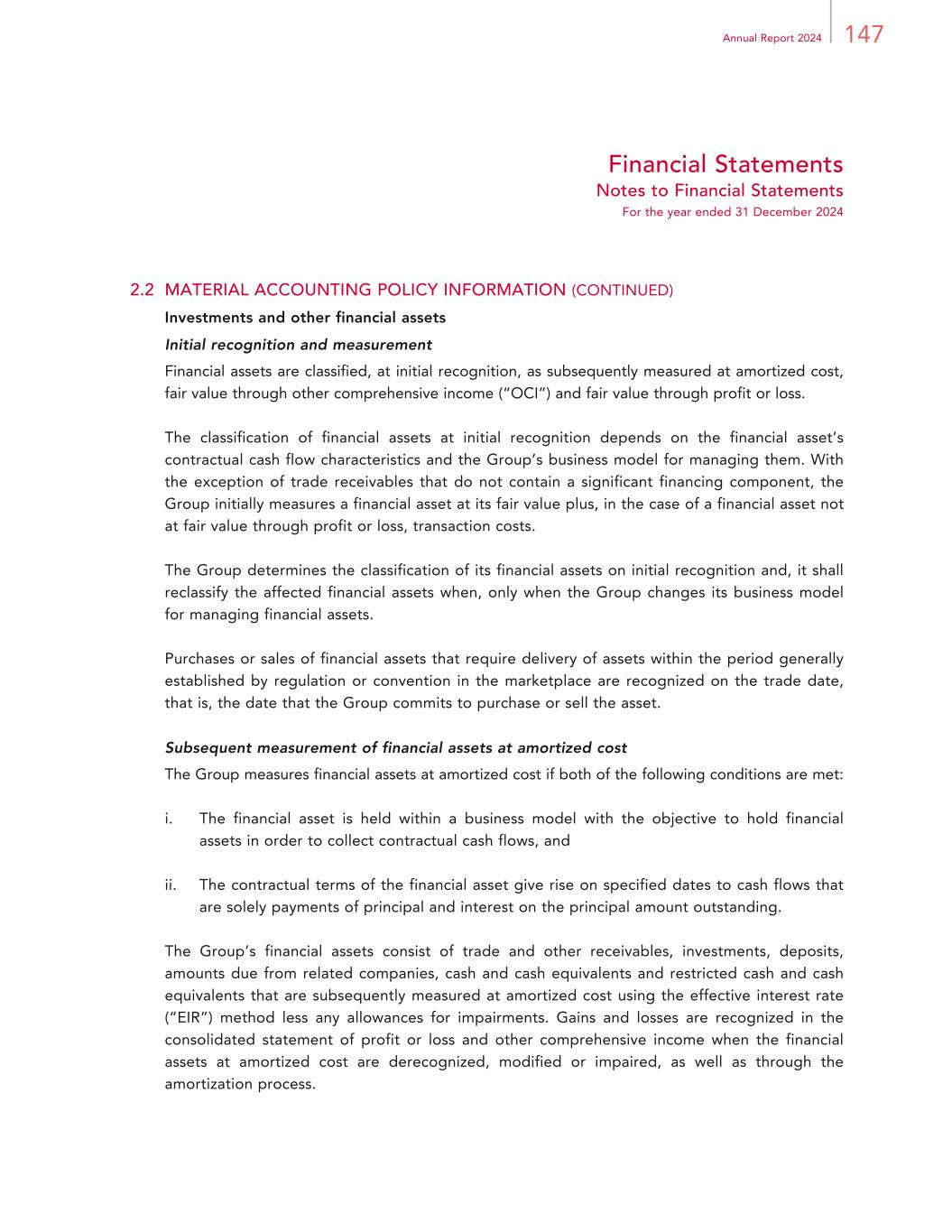 147Annual Report 2024 Financial Statements Notes to Financial Statements For the year ended 31 December 2024 2.2 MATERIAL ACCOUNTING POLICY INFORMATION (CONTINUED) Investments and other financial assets Initial recognition and measurement Financial assets are classified, at initial recognition, as subsequently measured at amortized cost, fair value through other comprehensive income (“OCI”) and fair value through profit or loss. The classification of financial assets at initial recognition depends on the financial asset’s contractual cash flow characteristics and the Group’s business model for managing them. With the exception of trade receivables that do not contain a significant financing component, the Group initially measures a financial asset at its fair value plus, in the case of a financial asset not at fair value through profit or loss, transaction costs. The Group determines the classification of its financial assets on initial recognition and, it shall reclassify the affected financial assets when, only when the Group changes its business model for managing financial assets. Purchases or sales of financial assets that require delivery of assets within the period generally established by regulation or convention in the marketplace are recognized on the trade date, that is, the date that the Group commits to purchase or sell the asset. Subsequent measurement of financial assets at amortized cost The Group measures financial assets at amortized cost if both of the following conditions are met: i. The financial asset is held within a business model with the objective to hold financial assets in order to collect contractual cash flows, and ii. The contractual terms of the financial asset give rise on specified dates to cash flows that are solely payments of principal and interest on the principal amount outstanding. The Group’s financial assets consist of trade and other receivables, investments, deposits, amounts due from related companies, cash and cash equivalents and restricted cash and cash equivalents that are subsequently measured at amortized cost using the effective interest rate (“EIR”) method less any allowances for impairments. Gains and losses are recognized in the consolidated statement of profit or loss and other comprehensive income when the financial assets at amortized cost are derecognized, modified or impaired, as well as through the amortization process.