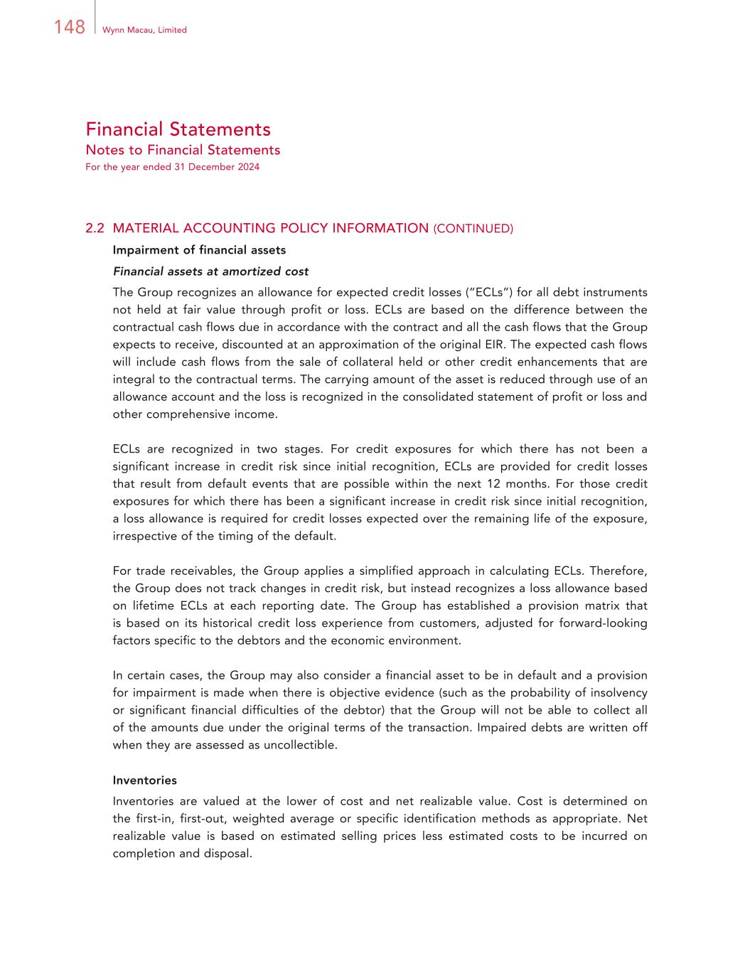 148 Wynn Macau, Limited Financial Statements Notes to Financial Statements For the year ended 31 December 2024 2.2 MATERIAL ACCOUNTING POLICY INFORMATION (CONTINUED) Impairment of financial assets Financial assets at amortized cost The Group recognizes an allowance for expected credit losses (“ECLs”) for all debt instruments not held at fair value through profit or loss. ECLs are based on the difference between the contractual cash flows due in accordance with the contract and all the cash flows that the Group expects to receive, discounted at an approximation of the original EIR. The expected cash flows will include cash flows from the sale of collateral held or other credit enhancements that are integral to the contractual terms. The carrying amount of the asset is reduced through use of an allowance account and the loss is recognized in the consolidated statement of profit or loss and other comprehensive income. ECLs are recognized in two stages. For credit exposures for which there has not been a significant increase in credit risk since initial recognition, ECLs are provided for credit losses that result from default events that are possible within the next 12 months. For those credit exposures for which there has been a significant increase in credit risk since initial recognition, a loss allowance is required for credit losses expected over the remaining life of the exposure, irrespective of the timing of the default. For trade receivables, the Group applies a simplified approach in calculating ECLs. Therefore, the Group does not track changes in credit risk, but instead recognizes a loss allowance based on lifetime ECLs at each reporting date. The Group has established a provision matrix that is based on its historical credit loss experience from customers, adjusted for forward-looking factors specific to the debtors and the economic environment. In certain cases, the Group may also consider a financial asset to be in default and a provision for impairment is made when there is objective evidence (such as the probability of insolvency or significant financial difficulties of the debtor) that the Group will not be able to collect all of the amounts due under the original terms of the transaction. Impaired debts are written off when they are assessed as uncollectible. Inventories Inventories are valued at the lower of cost and net realizable value. Cost is determined on the first-in, first-out, weighted average or specific identification methods as appropriate. Net realizable value is based on estimated selling prices less estimated costs to be incurred on completion and disposal.