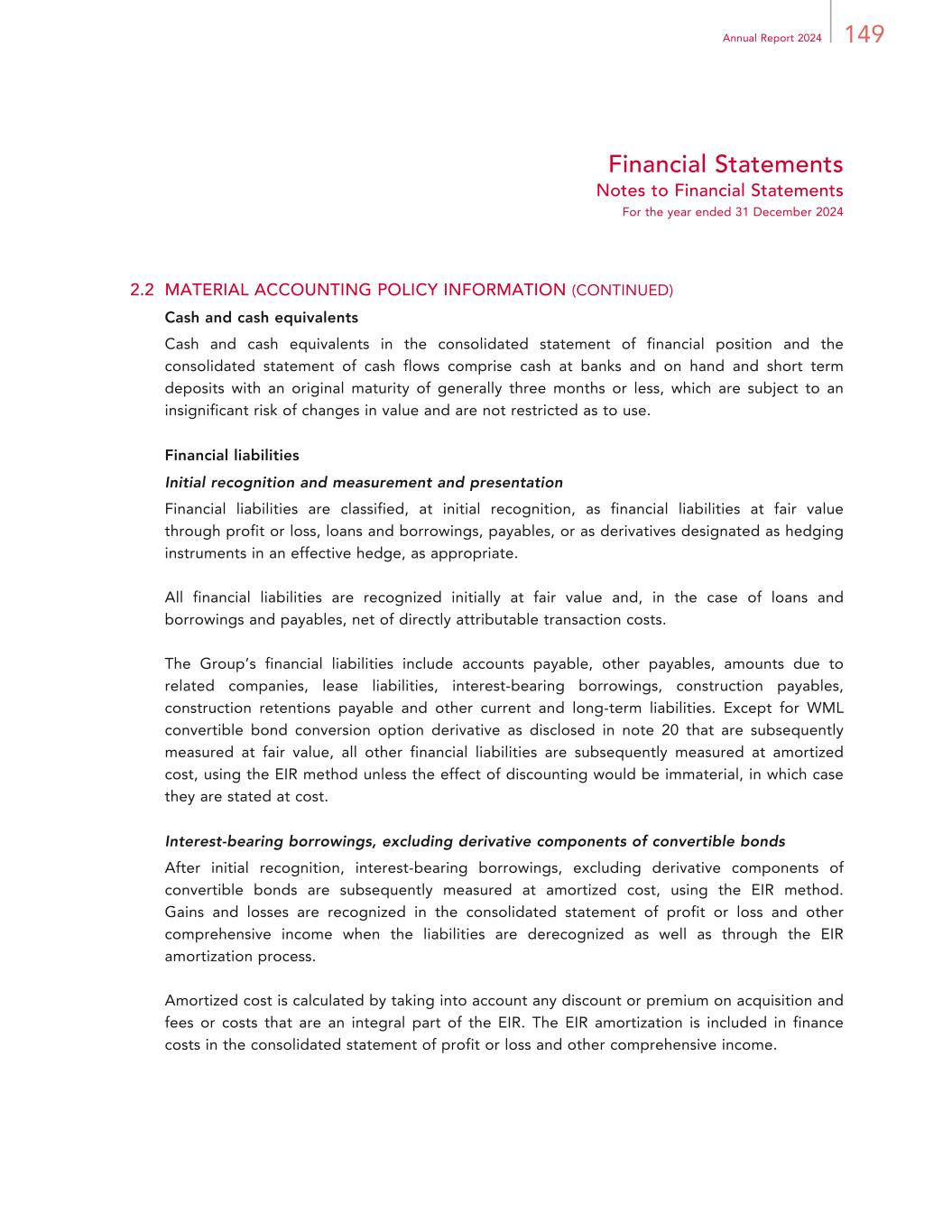 149Annual Report 2024 Financial Statements Notes to Financial Statements For the year ended 31 December 2024 2.2 MATERIAL ACCOUNTING POLICY INFORMATION (CONTINUED) Cash and cash equivalents Cash and cash equivalents in the consolidated statement of financial position and the consolidated statement of cash flows comprise cash at banks and on hand and short term deposits with an original maturity of generally three months or less, which are subject to an insignificant risk of changes in value and are not restricted as to use. Financial liabilities Initial recognition and measurement and presentation Financial liabilities are classified, at initial recognition, as financial liabilities at fair value through profit or loss, loans and borrowings, payables, or as derivatives designated as hedging instruments in an effective hedge, as appropriate. All financial liabilities are recognized initially at fair value and, in the case of loans and borrowings and payables, net of directly attributable transaction costs. The Group’s financial liabilities include accounts payable, other payables, amounts due to related companies, lease liabilities, interest-bearing borrowings, construction payables, construction retentions payable and other current and long-term liabilities. Except for WML convertible bond conversion option derivative as disclosed in note 20 that are subsequently measured at fair value, all other financial liabilities are subsequently measured at amortized cost, using the EIR method unless the effect of discounting would be immaterial, in which case they are stated at cost. Interest-bearing borrowings, excluding derivative components of convertible bonds After initial recognition, interest-bearing borrowings, excluding derivative components of convertible bonds are subsequently measured at amortized cost, using the EIR method. Gains and losses are recognized in the consolidated statement of profit or loss and other comprehensive income when the liabilities are derecognized as well as through the EIR amortization process. Amortized cost is calculated by taking into account any discount or premium on acquisition and fees or costs that are an integral part of the EIR. The EIR amortization is included in finance costs in the consolidated statement of profit or loss and other comprehensive income.