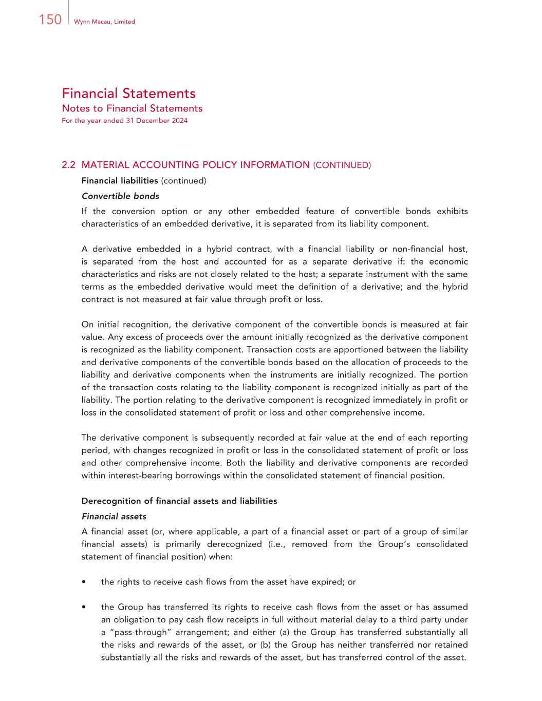 150 Wynn Macau, Limited Financial Statements Notes to Financial Statements For the year ended 31 December 2024 2.2 MATERIAL ACCOUNTING POLICY INFORMATION (CONTINUED) Financial liabilities (continued) Convertible bonds If the conversion option or any other embedded feature of convertible bonds exhibits characteristics of an embedded derivative, it is separated from its liability component. A derivative embedded in a hybrid contract, with a financial liability or non-financial host, is separated from the host and accounted for as a separate derivative if: the economic characteristics and risks are not closely related to the host; a separate instrument with the same terms as the embedded derivative would meet the definition of a derivative; and the hybrid contract is not measured at fair value through profit or loss. On initial recognition, the derivative component of the convertible bonds is measured at fair value. Any excess of proceeds over the amount initially recognized as the derivative component is recognized as the liability component. Transaction costs are apportioned between the liability and derivative components of the convertible bonds based on the allocation of proceeds to the liability and derivative components when the instruments are initially recognized. The portion of the transaction costs relating to the liability component is recognized initially as part of the liability. The portion relating to the derivative component is recognized immediately in profit or loss in the consolidated statement of profit or loss and other comprehensive income. The derivative component is subsequently recorded at fair value at the end of each reporting period, with changes recognized in profit or loss in the consolidated statement of profit or loss and other comprehensive income. Both the liability and derivative components are recorded within interest-bearing borrowings within the consolidated statement of financial position. Derecognition of financial assets and liabilities Financial assets A financial asset (or, where applicable, a part of a financial asset or part of a group of similar financial assets) is primarily derecognized (i.e., removed from the Group’s consolidated statement of financial position) when: • the rights to receive cash flows from the asset have expired; or • the Group has transferred its rights to receive cash flows from the asset or has assumed an obligation to pay cash flow receipts in full without material delay to a third party under a “pass-through” arrangement; and either (a) the Group has transferred substantially all the risks and rewards of the asset, or (b) the Group has neither transferred nor retained substantially all the risks and rewards of the asset, but has transferred control of the asset.