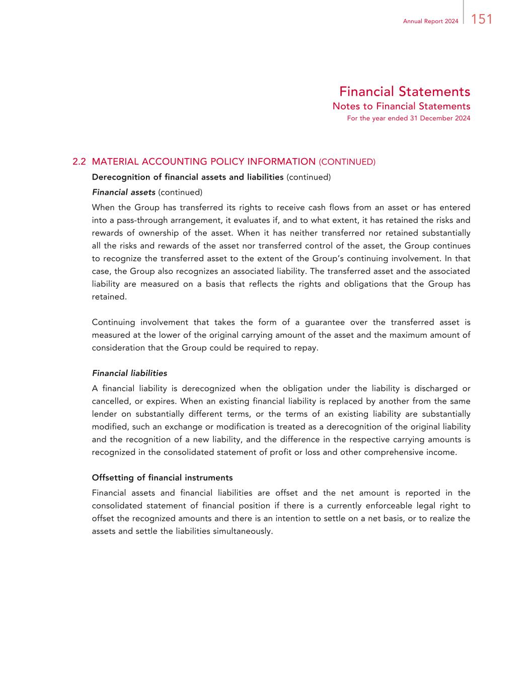 151Annual Report 2024 Financial Statements Notes to Financial Statements For the year ended 31 December 2024 2.2 MATERIAL ACCOUNTING POLICY INFORMATION (CONTINUED) Derecognition of financial assets and liabilities (continued) Financial assets (continued) When the Group has transferred its rights to receive cash flows from an asset or has entered into a pass-through arrangement, it evaluates if, and to what extent, it has retained the risks and rewards of ownership of the asset. When it has neither transferred nor retained substantially all the risks and rewards of the asset nor transferred control of the asset, the Group continues to recognize the transferred asset to the extent of the Group’s continuing involvement. In that case, the Group also recognizes an associated liability. The transferred asset and the associated liability are measured on a basis that reflects the rights and obligations that the Group has retained. Continuing involvement that takes the form of a guarantee over the transferred asset is measured at the lower of the original carrying amount of the asset and the maximum amount of consideration that the Group could be required to repay. Financial liabilities A financial liability is derecognized when the obligation under the liability is discharged or cancelled, or expires. When an existing financial liability is replaced by another from the same lender on substantially different terms, or the terms of an existing liability are substantially modified, such an exchange or modification is treated as a derecognition of the original liability and the recognition of a new liability, and the difference in the respective carrying amounts is recognized in the consolidated statement of profit or loss and other comprehensive income. Offsetting of financial instruments Financial assets and financial liabilities are offset and the net amount is reported in the consolidated statement of financial position if there is a currently enforceable legal right to offset the recognized amounts and there is an intention to settle on a net basis, or to realize the assets and settle the liabilities simultaneously.