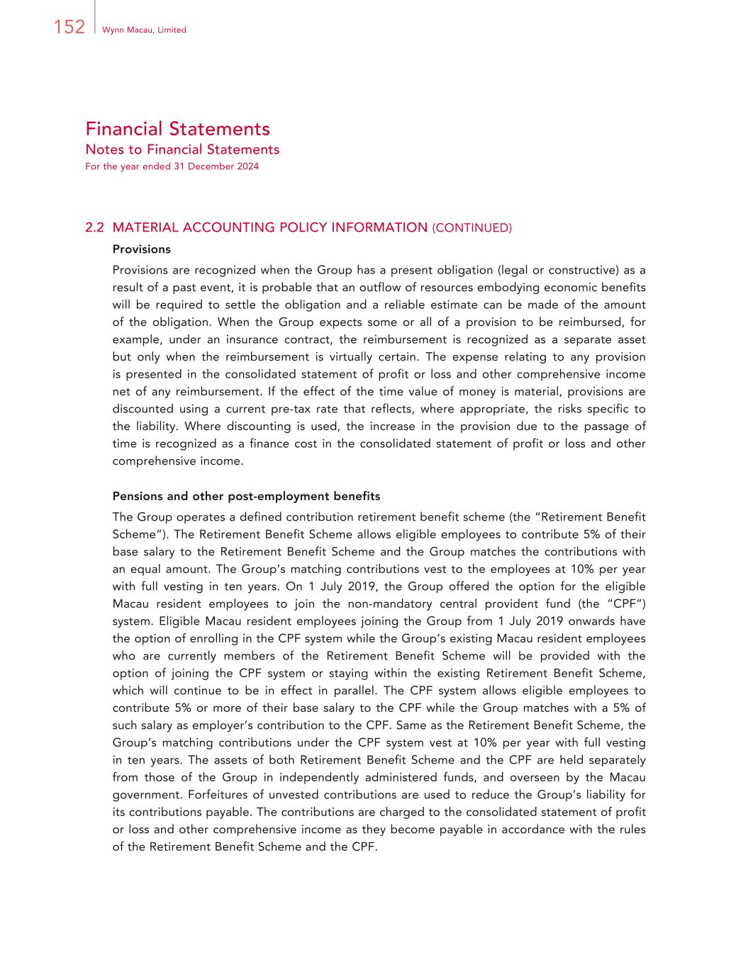 152 Wynn Macau, Limited Financial Statements Notes to Financial Statements For the year ended 31 December 2024 2.2 MATERIAL ACCOUNTING POLICY INFORMATION (CONTINUED) Provisions Provisions are recognized when the Group has a present obligation (legal or constructive) as a result of a past event, it is probable that an outflow of resources embodying economic benefits will be required to settle the obligation and a reliable estimate can be made of the amount of the obligation. When the Group expects some or all of a provision to be reimbursed, for example, under an insurance contract, the reimbursement is recognized as a separate asset but only when the reimbursement is virtually certain. The expense relating to any provision is presented in the consolidated statement of profit or loss and other comprehensive income net of any reimbursement. If the effect of the time value of money is material, provisions are discounted using a current pre-tax rate that reflects, where appropriate, the risks specific to the liability. Where discounting is used, the increase in the provision due to the passage of time is recognized as a finance cost in the consolidated statement of profit or loss and other comprehensive income. Pensions and other post-employment benefits The Group operates a defined contribution retirement benefit scheme (the “Retirement Benefit Scheme”). The Retirement Benefit Scheme allows eligible employees to contribute 5% of their base salary to the Retirement Benefit Scheme and the Group matches the contributions with an equal amount. The Group’s matching contributions vest to the employees at 10% per year with full vesting in ten years. On 1 July 2019, the Group offered the option for the eligible Macau resident employees to join the non-mandatory central provident fund (the “CPF”) system. Eligible Macau resident employees joining the Group from 1 July 2019 onwards have the option of enrolling in the CPF system while the Group’s existing Macau resident employees who are currently members of the Retirement Benefit Scheme will be provided with the option of joining the CPF system or staying within the existing Retirement Benefit Scheme, which will continue to be in effect in parallel. The CPF system allows eligible employees to contribute 5% or more of their base salary to the CPF while the Group matches with a 5% of such salary as employer’s contribution to the CPF. Same as the Retirement Benefit Scheme, the Group’s matching contributions under the CPF system vest at 10% per year with full vesting in ten years. The assets of both Retirement Benefit Scheme and the CPF are held separately from those of the Group in independently administered funds, and overseen by the Macau government. Forfeitures of unvested contributions are used to reduce the Group’s liability for its contributions payable. The contributions are charged to the consolidated statement of profit or loss and other comprehensive income as they become payable in accordance with the rules of the Retirement Benefit Scheme and the CPF.