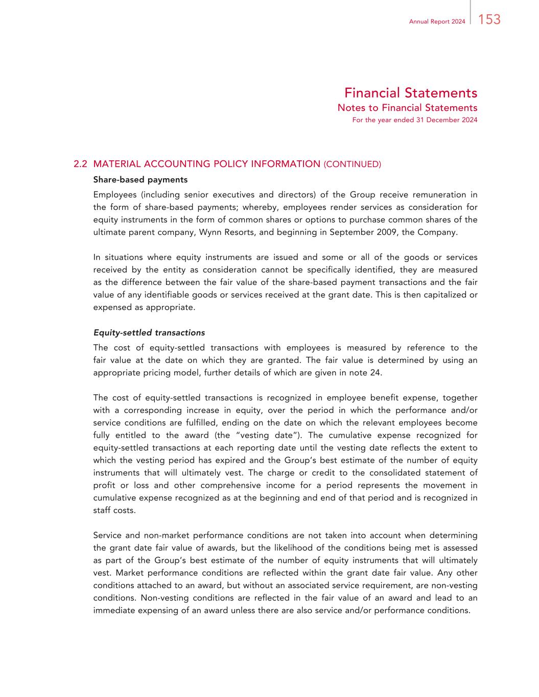 153Annual Report 2024 Financial Statements Notes to Financial Statements For the year ended 31 December 2024 2.2 MATERIAL ACCOUNTING POLICY INFORMATION (CONTINUED) Share-based payments Employees (including senior executives and directors) of the Group receive remuneration in the form of share-based payments; whereby, employees render services as consideration for equity instruments in the form of common shares or options to purchase common shares of the ultimate parent company, Wynn Resorts, and beginning in September 2009, the Company. In situations where equity instruments are issued and some or all of the goods or services received by the entity as consideration cannot be specifically identified, they are measured as the difference between the fair value of the share-based payment transactions and the fair value of any identifiable goods or services received at the grant date. This is then capitalized or expensed as appropriate. Equity-settled transactions The cost of equity-settled transactions with employees is measured by reference to the fair value at the date on which they are granted. The fair value is determined by using an appropriate pricing model, further details of which are given in note 24. The cost of equity-settled transactions is recognized in employee benefit expense, together with a corresponding increase in equity, over the period in which the performance and/or service conditions are fulfilled, ending on the date on which the relevant employees become fully entitled to the award (the “vesting date”). The cumulative expense recognized for equity-settled transactions at each reporting date until the vesting date reflects the extent to which the vesting period has expired and the Group’s best estimate of the number of equity instruments that will ultimately vest. The charge or credit to the consolidated statement of profit or loss and other comprehensive income for a period represents the movement in cumulative expense recognized as at the beginning and end of that period and is recognized in staff costs. Service and non-market performance conditions are not taken into account when determining the grant date fair value of awards, but the likelihood of the conditions being met is assessed as part of the Group’s best estimate of the number of equity instruments that will ultimately vest. Market performance conditions are reflected within the grant date fair value. Any other conditions attached to an award, but without an associated service requirement, are non-vesting conditions. Non-vesting conditions are reflected in the fair value of an award and lead to an immediate expensing of an award unless there are also service and/or performance conditions.