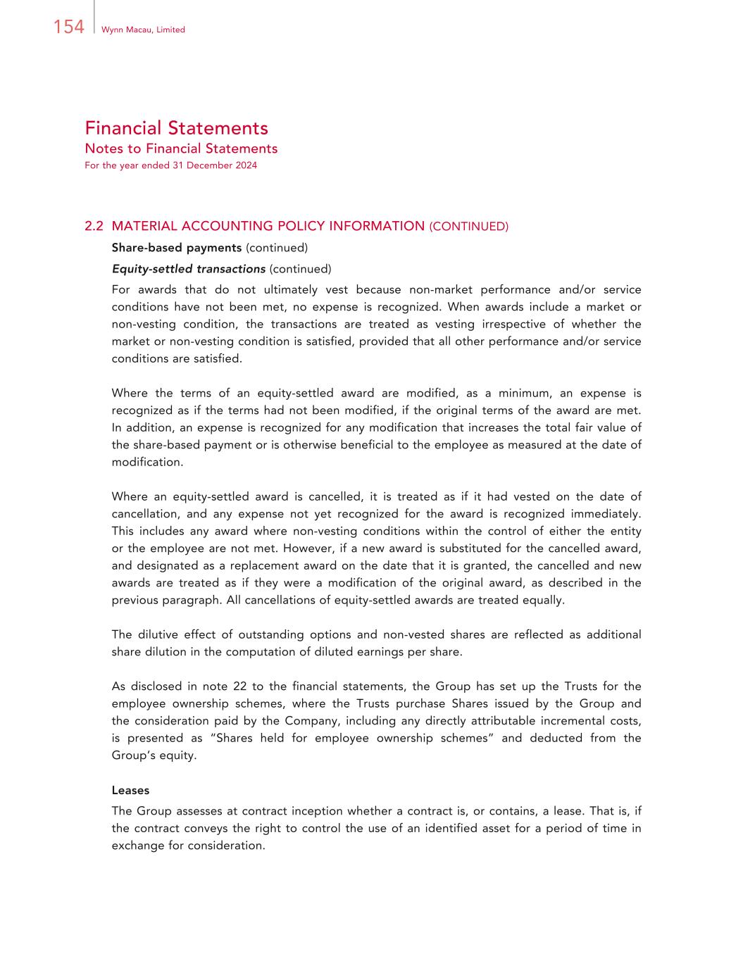 154 Wynn Macau, Limited Financial Statements Notes to Financial Statements For the year ended 31 December 2024 2.2 MATERIAL ACCOUNTING POLICY INFORMATION (CONTINUED) Share-based payments (continued) Equity-settled transactions (continued) For awards that do not ultimately vest because non-market performance and/or service conditions have not been met, no expense is recognized. When awards include a market or non-vesting condition, the transactions are treated as vesting irrespective of whether the market or non-vesting condition is satisfied, provided that all other performance and/or service conditions are satisfied. Where the terms of an equity-settled award are modified, as a minimum, an expense is recognized as if the terms had not been modified, if the original terms of the award are met. In addition, an expense is recognized for any modification that increases the total fair value of the share-based payment or is otherwise beneficial to the employee as measured at the date of modification. Where an equity-settled award is cancelled, it is treated as if it had vested on the date of cancellation, and any expense not yet recognized for the award is recognized immediately. This includes any award where non-vesting conditions within the control of either the entity or the employee are not met. However, if a new award is substituted for the cancelled award, and designated as a replacement award on the date that it is granted, the cancelled and new awards are treated as if they were a modification of the original award, as described in the previous paragraph. All cancellations of equity-settled awards are treated equally. The dilutive effect of outstanding options and non-vested shares are reflected as additional share dilution in the computation of diluted earnings per share. As disclosed in note 22 to the financial statements, the Group has set up the Trusts for the employee ownership schemes, where the Trusts purchase Shares issued by the Group and the consideration paid by the Company, including any directly attributable incremental costs, is presented as “Shares held for employee ownership schemes” and deducted from the Group’s equity. Leases The Group assesses at contract inception whether a contract is, or contains, a lease. That is, if the contract conveys the right to control the use of an identified asset for a period of time in exchange for consideration.