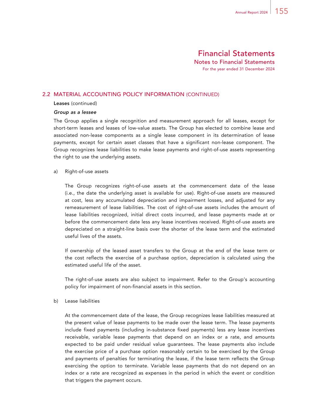 155Annual Report 2024 Financial Statements Notes to Financial Statements For the year ended 31 December 2024 2.2 MATERIAL ACCOUNTING POLICY INFORMATION (CONTINUED) Leases (continued) Group as a lessee The Group applies a single recognition and measurement approach for all leases, except for short-term leases and leases of low-value assets. The Group has elected to combine lease and associated non-lease components as a single lease component in its determination of lease payments, except for certain asset classes that have a significant non-lease component. The Group recognizes lease liabilities to make lease payments and right-of-use assets representing the right to use the underlying assets. a) Right-of-use assets The Group recognizes right-of-use assets at the commencement date of the lease (i.e., the date the underlying asset is available for use). Right-of-use assets are measured at cost, less any accumulated depreciation and impairment losses, and adjusted for any remeasurement of lease liabilities. The cost of right-of-use assets includes the amount of lease liabilities recognized, initial direct costs incurred, and lease payments made at or before the commencement date less any lease incentives received. Right-of-use assets are depreciated on a straight-line basis over the shorter of the lease term and the estimated useful lives of the assets. If ownership of the leased asset transfers to the Group at the end of the lease term or the cost reflects the exercise of a purchase option, depreciation is calculated using the estimated useful life of the asset. The right-of-use assets are also subject to impairment. Refer to the Group’s accounting policy for impairment of non-financial assets in this section. b) Lease liabilities At the commencement date of the lease, the Group recognizes lease liabilities measured at the present value of lease payments to be made over the lease term. The lease payments include fixed payments (including in-substance fixed payments) less any lease incentives receivable, variable lease payments that depend on an index or a rate, and amounts expected to be paid under residual value guarantees. The lease payments also include the exercise price of a purchase option reasonably certain to be exercised by the Group and payments of penalties for terminating the lease, if the lease term reflects the Group exercising the option to terminate. Variable lease payments that do not depend on an index or a rate are recognized as expenses in the period in which the event or condition that triggers the payment occurs.