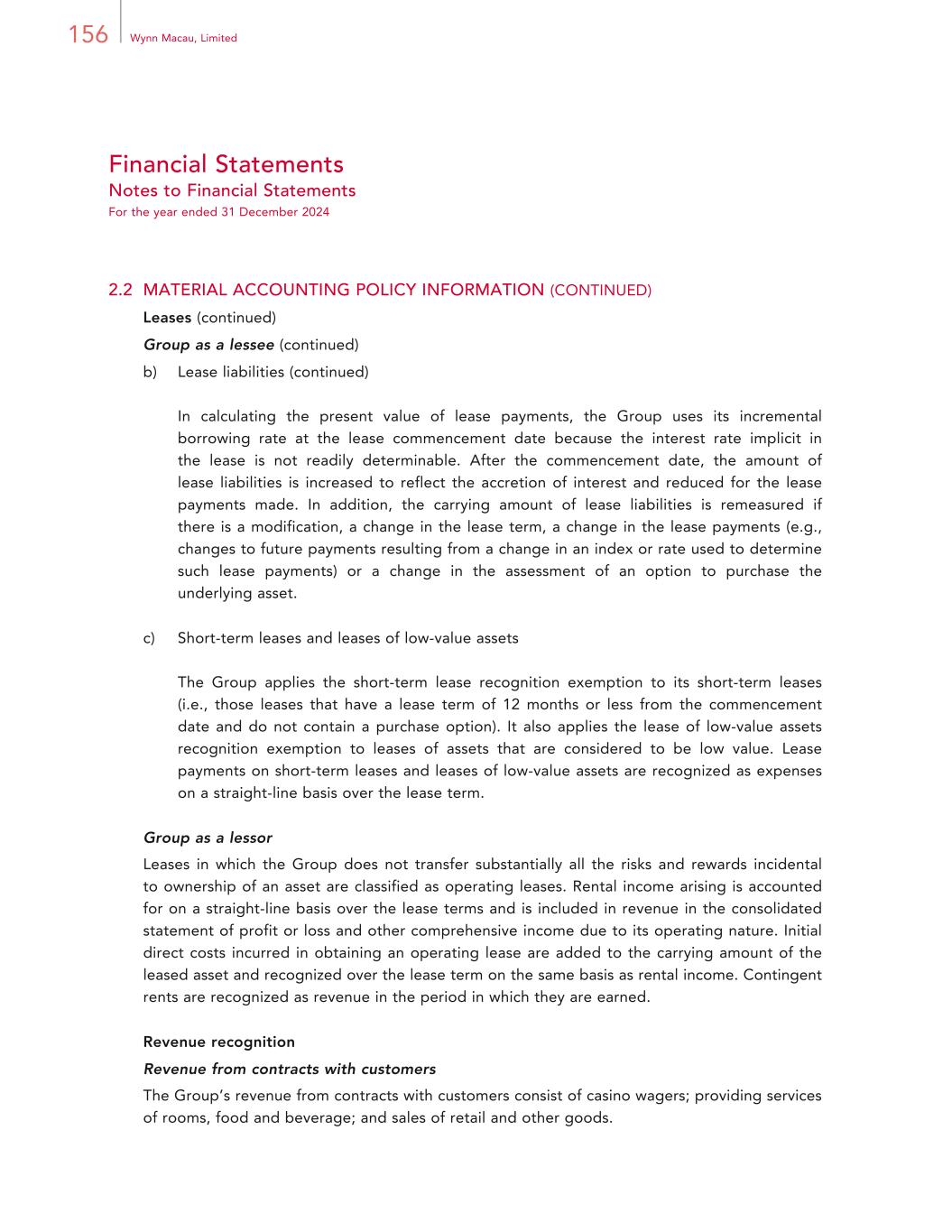 156 Wynn Macau, Limited Financial Statements Notes to Financial Statements For the year ended 31 December 2024 2.2 MATERIAL ACCOUNTING POLICY INFORMATION (CONTINUED) Leases (continued) Group as a lessee (continued) b) Lease liabilities (continued) In calculating the present value of lease payments, the Group uses its incremental borrowing rate at the lease commencement date because the interest rate implicit in the lease is not readily determinable. After the commencement date, the amount of lease liabilities is increased to reflect the accretion of interest and reduced for the lease payments made. In addition, the carrying amount of lease liabilities is remeasured if there is a modification, a change in the lease term, a change in the lease payments (e.g., changes to future payments resulting from a change in an index or rate used to determine such lease payments) or a change in the assessment of an option to purchase the underlying asset. c) Short-term leases and leases of low-value assets The Group applies the short-term lease recognition exemption to its short-term leases (i.e., those leases that have a lease term of 12 months or less from the commencement date and do not contain a purchase option). It also applies the lease of low-value assets recognition exemption to leases of assets that are considered to be low value. Lease payments on short-term leases and leases of low-value assets are recognized as expenses on a straight-line basis over the lease term. Group as a lessor Leases in which the Group does not transfer substantially all the risks and rewards incidental to ownership of an asset are classified as operating leases. Rental income arising is accounted for on a straight-line basis over the lease terms and is included in revenue in the consolidated statement of profit or loss and other comprehensive income due to its operating nature. Initial direct costs incurred in obtaining an operating lease are added to the carrying amount of the leased asset and recognized over the lease term on the same basis as rental income. Contingent rents are recognized as revenue in the period in which they are earned. Revenue recognition Revenue from contracts with customers The Group’s revenue from contracts with customers consist of casino wagers; providing services of rooms, food and beverage; and sales of retail and other goods.