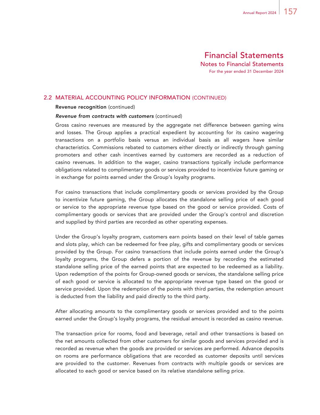 157Annual Report 2024 Financial Statements Notes to Financial Statements For the year ended 31 December 2024 2.2 MATERIAL ACCOUNTING POLICY INFORMATION (CONTINUED) Revenue recognition (continued) Revenue from contracts with customers (continued) Gross casino revenues are measured by the aggregate net difference between gaming wins and losses. The Group applies a practical expedient by accounting for its casino wagering transactions on a portfolio basis versus an individual basis as all wagers have similar characteristics. Commissions rebated to customers either directly or indirectly through gaming promoters and other cash incentives earned by customers are recorded as a reduction of casino revenues. In addition to the wager, casino transactions typically include performance obligations related to complimentary goods or services provided to incentivize future gaming or in exchange for points earned under the Group’s loyalty programs. For casino transactions that include complimentary goods or services provided by the Group to incentivize future gaming, the Group allocates the standalone selling price of each good or service to the appropriate revenue type based on the good or service provided. Costs of complimentary goods or services that are provided under the Group’s control and discretion and supplied by third parties are recorded as other operating expenses. Under the Group’s loyalty program, customers earn points based on their level of table games and slots play, which can be redeemed for free play, gifts and complimentary goods or services provided by the Group. For casino transactions that include points earned under the Group’s loyalty programs, the Group defers a portion of the revenue by recording the estimated standalone selling price of the earned points that are expected to be redeemed as a liability. Upon redemption of the points for Group-owned goods or services, the standalone selling price of each good or service is allocated to the appropriate revenue type based on the good or service provided. Upon the redemption of the points with third parties, the redemption amount is deducted from the liability and paid directly to the third party. After allocating amounts to the complimentary goods or services provided and to the points earned under the Group’s loyalty programs, the residual amount is recorded as casino revenue. The transaction price for rooms, food and beverage, retail and other transactions is based on the net amounts collected from other customers for similar goods and services provided and is recorded as revenue when the goods are provided or services are performed. Advance deposits on rooms are performance obligations that are recorded as customer deposits until services are provided to the customer. Revenues from contracts with multiple goods or services are allocated to each good or service based on its relative standalone selling price.