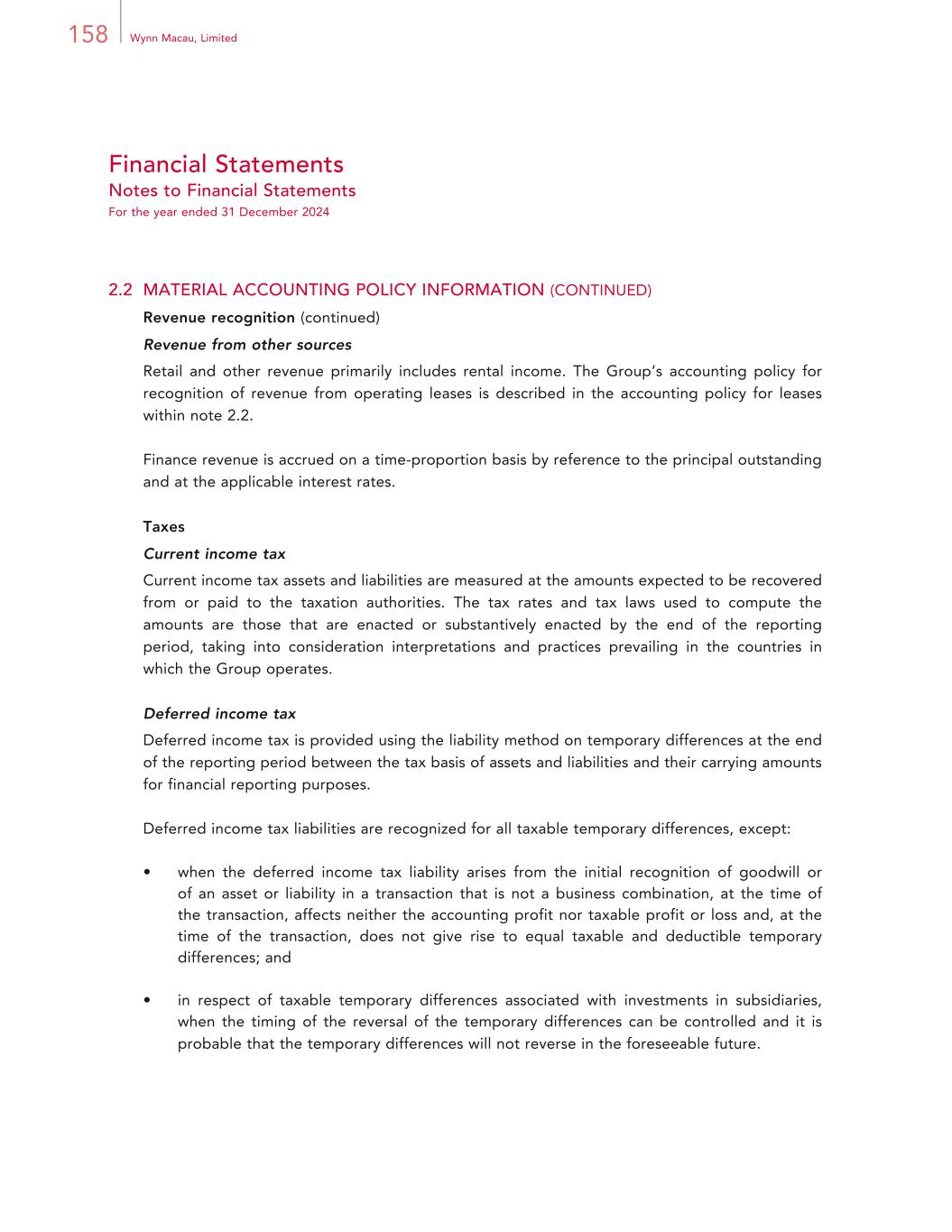 158 Wynn Macau, Limited Financial Statements Notes to Financial Statements For the year ended 31 December 2024 2.2 MATERIAL ACCOUNTING POLICY INFORMATION (CONTINUED) Revenue recognition (continued) Revenue from other sources Retail and other revenue primarily includes rental income. The Group’s accounting policy for recognition of revenue from operating leases is described in the accounting policy for leases within note 2.2. Finance revenue is accrued on a time-proportion basis by reference to the principal outstanding and at the applicable interest rates. Taxes Current income tax Current income tax assets and liabilities are measured at the amounts expected to be recovered from or paid to the taxation authorities. The tax rates and tax laws used to compute the amounts are those that are enacted or substantively enacted by the end of the reporting period, taking into consideration interpretations and practices prevailing in the countries in which the Group operates. Deferred income tax Deferred income tax is provided using the liability method on temporary differences at the end of the reporting period between the tax basis of assets and liabilities and their carrying amounts for financial reporting purposes. Deferred income tax liabilities are recognized for all taxable temporary differences, except: • when the deferred income tax liability arises from the initial recognition of goodwill or of an asset or liability in a transaction that is not a business combination, at the time of the transaction, affects neither the accounting profit nor taxable profit or loss and, at the time of the transaction, does not give rise to equal taxable and deductible temporary differences; and • in respect of taxable temporary differences associated with investments in subsidiaries, when the timing of the reversal of the temporary differences can be controlled and it is probable that the temporary differences will not reverse in the foreseeable future.