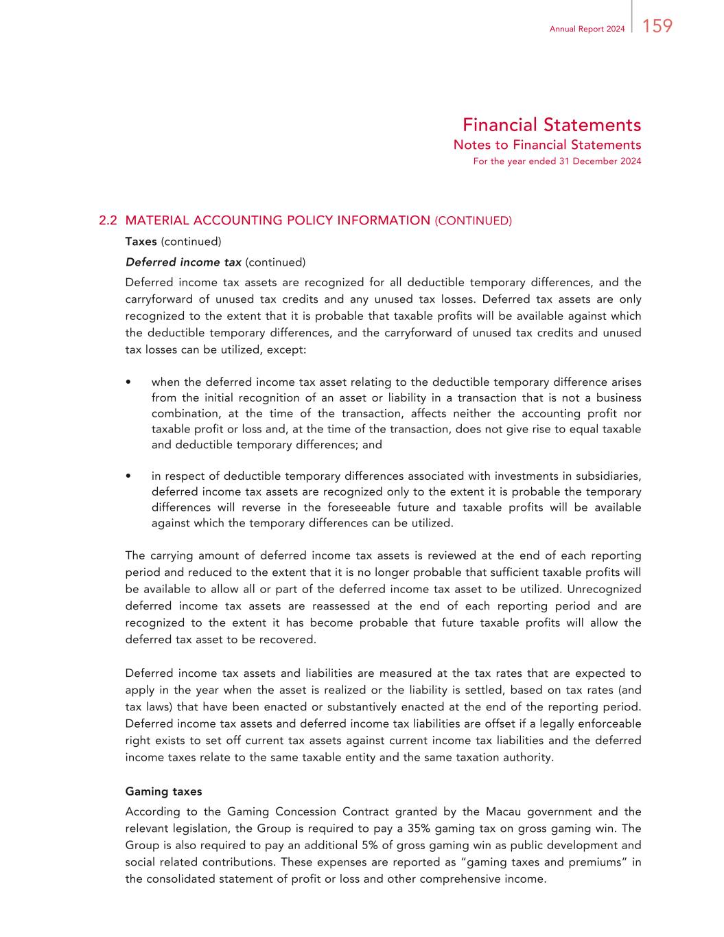 159Annual Report 2024 Financial Statements Notes to Financial Statements For the year ended 31 December 2024 2.2 MATERIAL ACCOUNTING POLICY INFORMATION (CONTINUED) Taxes (continued) Deferred income tax (continued) Deferred income tax assets are recognized for all deductible temporary differences, and the carryforward of unused tax credits and any unused tax losses. Deferred tax assets are only recognized to the extent that it is probable that taxable profits will be available against which the deductible temporary differences, and the carryforward of unused tax credits and unused tax losses can be utilized, except: • when the deferred income tax asset relating to the deductible temporary difference arises from the initial recognition of an asset or liability in a transaction that is not a business combination, at the time of the transaction, affects neither the accounting profit nor taxable profit or loss and, at the time of the transaction, does not give rise to equal taxable and deductible temporary differences; and • in respect of deductible temporary differences associated with investments in subsidiaries, deferred income tax assets are recognized only to the extent it is probable the temporary differences will reverse in the foreseeable future and taxable profits will be available against which the temporary differences can be utilized. The carrying amount of deferred income tax assets is reviewed at the end of each reporting period and reduced to the extent that it is no longer probable that sufficient taxable profits will be available to allow all or part of the deferred income tax asset to be utilized. Unrecognized deferred income tax assets are reassessed at the end of each reporting period and are recognized to the extent it has become probable that future taxable profits will allow the deferred tax asset to be recovered. Deferred income tax assets and liabilities are measured at the tax rates that are expected to apply in the year when the asset is realized or the liability is settled, based on tax rates (and tax laws) that have been enacted or substantively enacted at the end of the reporting period. Deferred income tax assets and deferred income tax liabilities are offset if a legally enforceable right exists to set off current tax assets against current income tax liabilities and the deferred income taxes relate to the same taxable entity and the same taxation authority. Gaming taxes According to the Gaming Concession Contract granted by the Macau government and the relevant legislation, the Group is required to pay a 35% gaming tax on gross gaming win. The Group is also required to pay an additional 5% of gross gaming win as public development and social related contributions. These expenses are reported as “gaming taxes and premiums” in the consolidated statement of profit or loss and other comprehensive income.