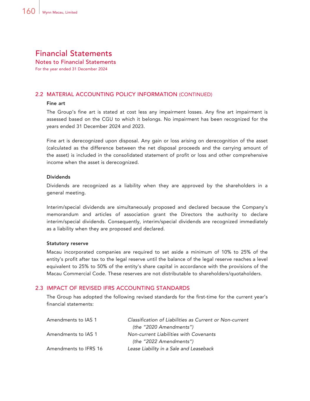 160 Wynn Macau, Limited Financial Statements Notes to Financial Statements For the year ended 31 December 2024 2.2 MATERIAL ACCOUNTING POLICY INFORMATION (CONTINUED) Fine art The Group’s fine art is stated at cost less any impairment losses. Any fine art impairment is assessed based on the CGU to which it belongs. No impairment has been recognized for the years ended 31 December 2024 and 2023. Fine art is derecognized upon disposal. Any gain or loss arising on derecognition of the asset (calculated as the difference between the net disposal proceeds and the carrying amount of the asset) is included in the consolidated statement of profit or loss and other comprehensive income when the asset is derecognized. Dividends Dividends are recognized as a liability when they are approved by the shareholders in a general meeting. Interim/special dividends are simultaneously proposed and declared because the Company’s memorandum and articles of association grant the Directors the authority to declare interim/special dividends. Consequently, interim/special dividends are recognized immediately as a liability when they are proposed and declared. Statutory reserve Macau incorporated companies are required to set aside a minimum of 10% to 25% of the entity’s profit after tax to the legal reserve until the balance of the legal reserve reaches a level equivalent to 25% to 50% of the entity’s share capital in accordance with the provisions of the Macau Commercial Code. These reserves are not distributable to shareholders/quotaholders. 2.3 IMPACT OF REVISED IFRS ACCOUNTING STANDARDS The Group has adopted the following revised standards for the first-time for the current year’s financial statements: Amendments to IAS 1 Classification of Liabilities as Current or Non-current (the “2020 Amendments”) Amendments to IAS 1 Non-current Liabilities with Covenants (the “2022 Amendments”) Amendments to IFRS 16 Lease Liability in a Sale and Leaseback