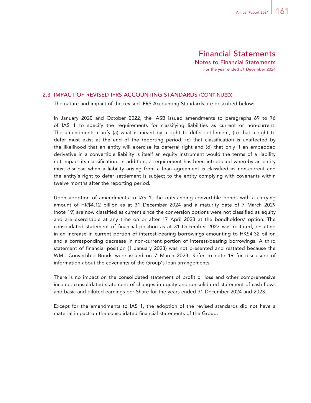 161Annual Report 2024 Financial Statements Notes to Financial Statements For the year ended 31 December 2024 2.3 IMPACT OF REVISED IFRS ACCOUNTING STANDARDS (CONTINUED) The nature and impact of the revised IFRS Accounting Standards are described below: In January 2020 and October 2022, the IASB issued amendments to paragraphs 69 to 76 of IAS 1 to specify the requirements for classifying liabilities as current or non-current. The amendments clarify (a) what is meant by a right to defer settlement; (b) that a right to defer must exist at the end of the reporting period; (c) that classification is unaffected by the likelihood that an entity will exercise its deferral right and (d) that only if an embedded derivative in a convertible liability is itself an equity instrument would the terms of a liability not impact its classification. In addition, a requirement has been introduced whereby an entity must disclose when a liability arising from a loan agreement is classified as non-current and the entity’s right to defer settlement is subject to the entity complying with covenants within twelve months after the reporting period. Upon adoption of amendments to IAS 1, the outstanding convertible bonds with a carrying amount of HK$4.12 billion as at 31 December 2024 and a maturity date of 7 March 2029 (note 19) are now classified as current since the conversion options were not classified as equity and are exercisable at any time on or after 17 April 2023 at the bondholders’ option. The consolidated statement of financial position as at 31 December 2023 was restated, resulting in an increase in current portion of interest-bearing borrowings amounting to HK$4.32 billion and a corresponding decrease in non-current portion of interest-bearing borrowings. A third statement of financial position (1 January 2023) was not presented and restated because the WML Convertible Bonds were issued on 7 March 2023. Refer to note 19 for disclosure of information about the covenants of the Group’s loan arrangements. There is no impact on the consolidated statement of profit or loss and other comprehensive income, consolidated statement of changes in equity and consolidated statement of cash flows and basic and diluted earnings per Share for the years ended 31 December 2024 and 2023. Except for the amendments to IAS 1, the adoption of the revised standards did not have a material impact on the consolidated financial statements of the Group.