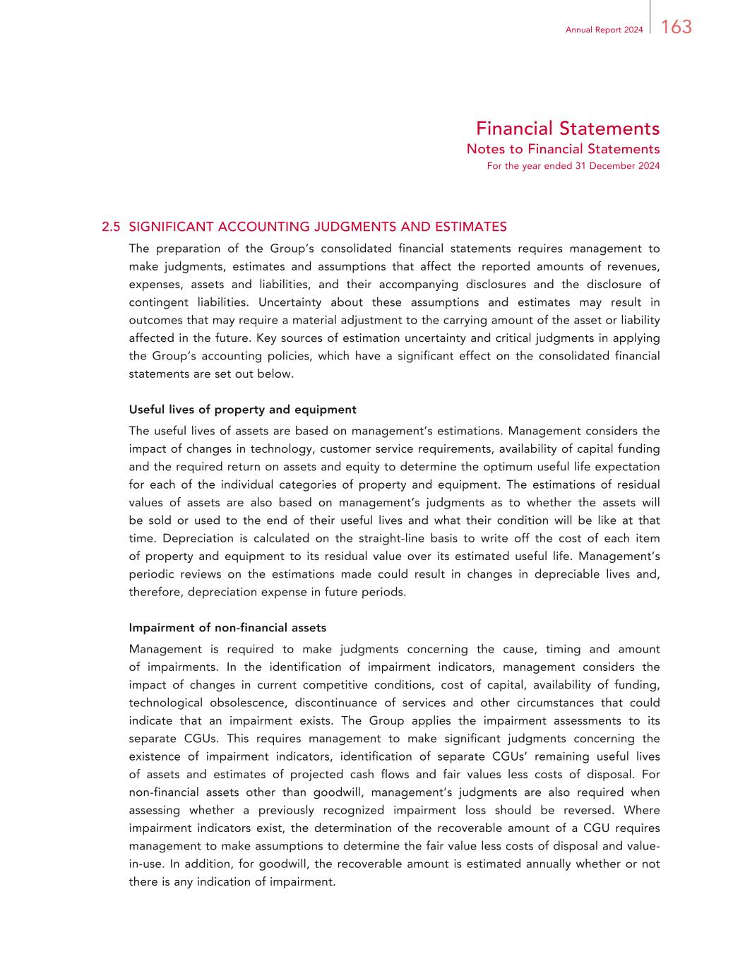 163Annual Report 2024 Financial Statements Notes to Financial Statements For the year ended 31 December 2024 2.5 SIGNIFICANT ACCOUNTING JUDGMENTS AND ESTIMATES The preparation of the Group’s consolidated financial statements requires management to make judgments, estimates and assumptions that affect the reported amounts of revenues, expenses, assets and liabilities, and their accompanying disclosures and the disclosure of contingent liabilities. Uncertainty about these assumptions and estimates may result in outcomes that may require a material adjustment to the carrying amount of the asset or liability affected in the future. Key sources of estimation uncertainty and critical judgments in applying the Group’s accounting policies, which have a significant effect on the consolidated financial statements are set out below. Useful lives of property and equipment The useful lives of assets are based on management’s estimations. Management considers the impact of changes in technology, customer service requirements, availability of capital funding and the required return on assets and equity to determine the optimum useful life expectation for each of the individual categories of property and equipment. The estimations of residual values of assets are also based on management’s judgments as to whether the assets will be sold or used to the end of their useful lives and what their condition will be like at that time. Depreciation is calculated on the straight-line basis to write off the cost of each item of property and equipment to its residual value over its estimated useful life. Management’s periodic reviews on the estimations made could result in changes in depreciable lives and, therefore, depreciation expense in future periods. Impairment of non-financial assets Management is required to make judgments concerning the cause, timing and amount of impairments. In the identification of impairment indicators, management considers the impact of changes in current competitive conditions, cost of capital, availability of funding, technological obsolescence, discontinuance of services and other circumstances that could indicate that an impairment exists. The Group applies the impairment assessments to its separate CGUs. This requires management to make significant judgments concerning the existence of impairment indicators, identification of separate CGUs’ remaining useful lives of assets and estimates of projected cash flows and fair values less costs of disposal. For non-financial assets other than goodwill, management’s judgments are also required when assessing whether a previously recognized impairment loss should be reversed. Where impairment indicators exist, the determination of the recoverable amount of a CGU requires management to make assumptions to determine the fair value less costs of disposal and value- in-use. In addition, for goodwill, the recoverable amount is estimated annually whether or not there is any indication of impairment.