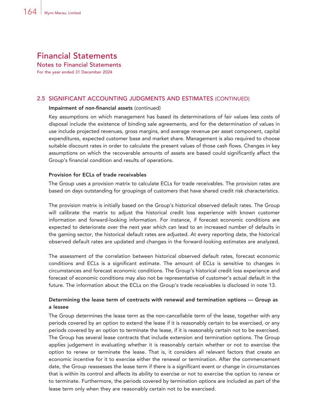 164 Wynn Macau, Limited Financial Statements Notes to Financial Statements For the year ended 31 December 2024 2.5 SIGNIFICANT ACCOUNTING JUDGMENTS AND ESTIMATES (CONTINUED) Impairment of non-financial assets (continued) Key assumptions on which management has based its determinations of fair values less costs of disposal include the existence of binding sale agreements, and for the determination of values in use include projected revenues, gross margins, and average revenue per asset component, capital expenditures, expected customer base and market share. Management is also required to choose suitable discount rates in order to calculate the present values of those cash flows. Changes in key assumptions on which the recoverable amounts of assets are based could significantly affect the Group’s financial condition and results of operations. Provision for ECLs of trade receivables The Group uses a provision matrix to calculate ECLs for trade receivables. The provision rates are based on days outstanding for groupings of customers that have shared credit risk characteristics. The provision matrix is initially based on the Group’s historical observed default rates. The Group will calibrate the matrix to adjust the historical credit loss experience with known customer information and forward-looking information. For instance, if forecast economic conditions are expected to deteriorate over the next year which can lead to an increased number of defaults in the gaming sector, the historical default rates are adjusted. At every reporting date, the historical observed default rates are updated and changes in the forward-looking estimates are analyzed. The assessment of the correlation between historical observed default rates, forecast economic conditions and ECLs is a significant estimate. The amount of ECLs is sensitive to changes in circumstances and forecast economic conditions. The Group’s historical credit loss experience and forecast of economic conditions may also not be representative of customer’s actual default in the future. The information about the ECLs on the Group’s trade receivables is disclosed in note 13. Determining the lease term of contracts with renewal and termination options — Group as a lessee The Group determines the lease term as the non-cancellable term of the lease, together with any periods covered by an option to extend the lease if it is reasonably certain to be exercised, or any periods covered by an option to terminate the lease, if it is reasonably certain not to be exercised. The Group has several lease contracts that include extension and termination options. The Group applies judgement in evaluating whether it is reasonably certain whether or not to exercise the option to renew or terminate the lease. That is, it considers all relevant factors that create an economic incentive for it to exercise either the renewal or termination. After the commencement date, the Group reassesses the lease term if there is a significant event or change in circumstances that is within its control and affects its ability to exercise or not to exercise the option to renew or to terminate. Furthermore, the periods covered by termination options are included as part of the lease term only when they are reasonably certain not to be exercised.