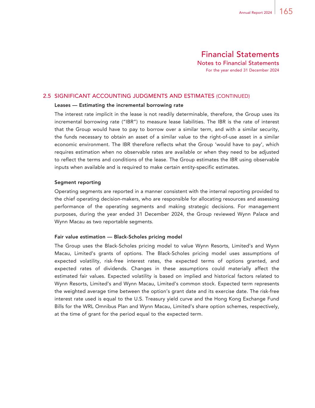 165Annual Report 2024 Financial Statements Notes to Financial Statements For the year ended 31 December 2024 2.5 SIGNIFICANT ACCOUNTING JUDGMENTS AND ESTIMATES (CONTINUED) Leases — Estimating the incremental borrowing rate The interest rate implicit in the lease is not readily determinable, therefore, the Group uses its incremental borrowing rate (“IBR”) to measure lease liabilities. The IBR is the rate of interest that the Group would have to pay to borrow over a similar term, and with a similar security, the funds necessary to obtain an asset of a similar value to the right-of-use asset in a similar economic environment. The IBR therefore reflects what the Group ‘would have to pay’, which requires estimation when no observable rates are available or when they need to be adjusted to reflect the terms and conditions of the lease. The Group estimates the IBR using observable inputs when available and is required to make certain entity-specific estimates. Segment reporting Operating segments are reported in a manner consistent with the internal reporting provided to the chief operating decision-makers, who are responsible for allocating resources and assessing performance of the operating segments and making strategic decisions. For management purposes, during the year ended 31 December 2024, the Group reviewed Wynn Palace and Wynn Macau as two reportable segments. Fair value estimation — Black-Scholes pricing model The Group uses the Black-Scholes pricing model to value Wynn Resorts, Limited’s and Wynn Macau, Limited’s grants of options. The Black-Scholes pricing model uses assumptions of expected volatility, risk-free interest rates, the expected terms of options granted, and expected rates of dividends. Changes in these assumptions could materially affect the estimated fair values. Expected volatility is based on implied and historical factors related to Wynn Resorts, Limited’s and Wynn Macau, Limited’s common stock. Expected term represents the weighted average time between the option’s grant date and its exercise date. The risk-free interest rate used is equal to the U.S. Treasury yield curve and the Hong Kong Exchange Fund Bills for the WRL Omnibus Plan and Wynn Macau, Limited’s share option schemes, respectively, at the time of grant for the period equal to the expected term.