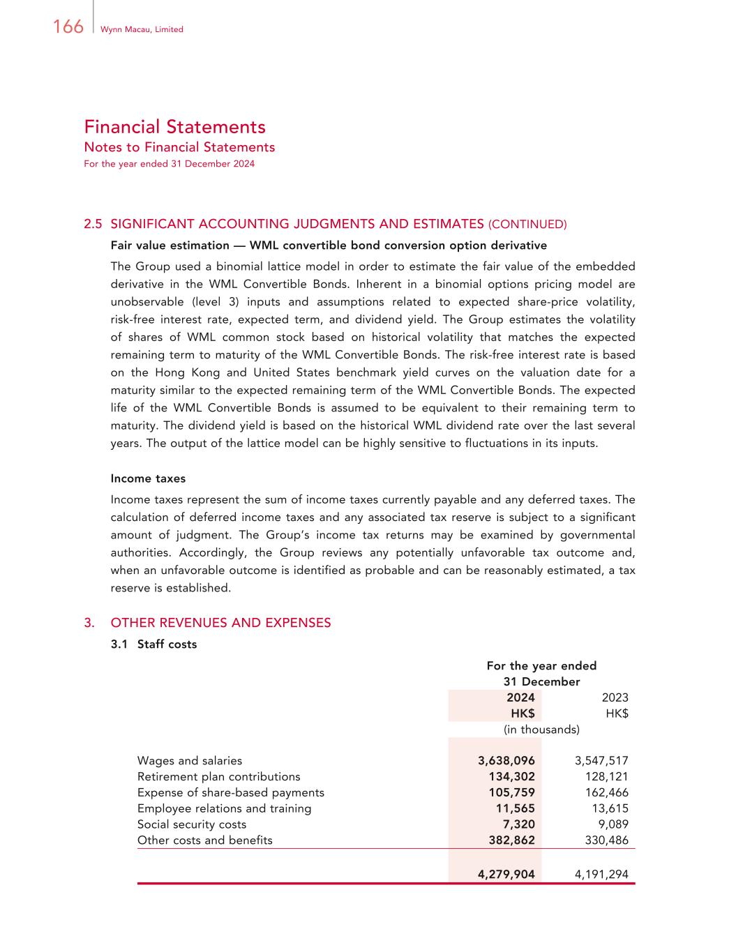 166 Wynn Macau, Limited Financial Statements Notes to Financial Statements For the year ended 31 December 2024 2.5 SIGNIFICANT ACCOUNTING JUDGMENTS AND ESTIMATES (CONTINUED) Fair value estimation — WML convertible bond conversion option derivative The Group used a binomial lattice model in order to estimate the fair value of the embedded derivative in the WML Convertible Bonds. Inherent in a binomial options pricing model are unobservable (level 3) inputs and assumptions related to expected share-price volatility, risk-free interest rate, expected term, and dividend yield. The Group estimates the volatility of shares of WML common stock based on historical volatility that matches the expected remaining term to maturity of the WML Convertible Bonds. The risk-free interest rate is based on the Hong Kong and United States benchmark yield curves on the valuation date for a maturity similar to the expected remaining term of the WML Convertible Bonds. The expected life of the WML Convertible Bonds is assumed to be equivalent to their remaining term to maturity. The dividend yield is based on the historical WML dividend rate over the last several years. The output of the lattice model can be highly sensitive to fluctuations in its inputs. Income taxes Income taxes represent the sum of income taxes currently payable and any deferred taxes. The calculation of deferred income taxes and any associated tax reserve is subject to a significant amount of judgment. The Group’s income tax returns may be examined by governmental authorities. Accordingly, the Group reviews any potentially unfavorable tax outcome and, when an unfavorable outcome is identified as probable and can be reasonably estimated, a tax reserve is established. 3. OTHER REVENUES AND EXPENSES 3.1 Staff costs For the year ended 31 December 2024 2023 HK$ HK$ (in thousands) Wages and salaries 3,638,096 3,547,517 Retirement plan contributions 134,302 128,121 Expense of share-based payments 105,759 162,466 Employee relations and training 11,565 13,615 Social security costs 7,320 9,089 Other costs and benefits 382,862 330,486 4,279,904 4,191,294