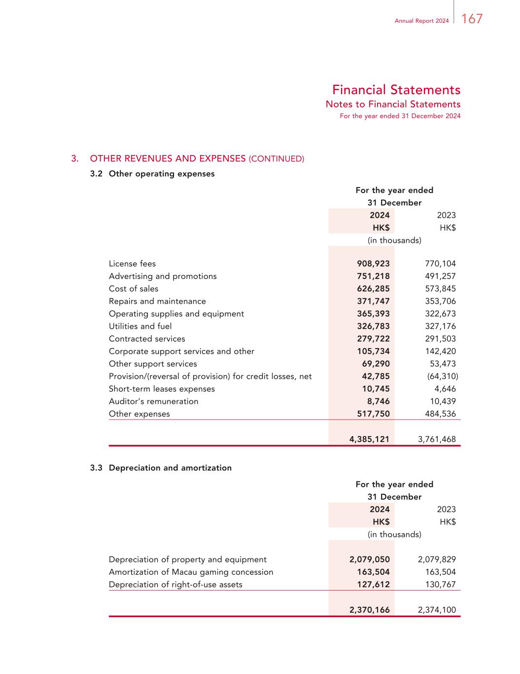 167Annual Report 2024 Financial Statements Notes to Financial Statements For the year ended 31 December 2024 3. OTHER REVENUES AND EXPENSES (CONTINUED) 3.2 Other operating expenses For the year ended 31 December 2024 2023 HK$ HK$ (in thousands) License fees 908,923 770,104 Advertising and promotions 751,218 491,257 Cost of sales 626,285 573,845 Repairs and maintenance 371,747 353,706 Operating supplies and equipment 365,393 322,673 Utilities and fuel 326,783 327,176 Contracted services 279,722 291,503 Corporate support services and other 105,734 142,420 Other support services 69,290 53,473 Provision/(reversal of provision) for credit losses, net 42,785 (64,310) Short-term leases expenses 10,745 4,646 Auditor’s remuneration 8,746 10,439 Other expenses 517,750 484,536 4,385,121 3,761,468 3.3 Depreciation and amortization For the year ended 31 December 2024 2023 HK$ HK$ (in thousands) Depreciation of property and equipment 2,079,050 2,079,829 Amortization of Macau gaming concession 163,504 163,504 Depreciation of right-of-use assets 127,612 130,767 2,370,166 2,374,100