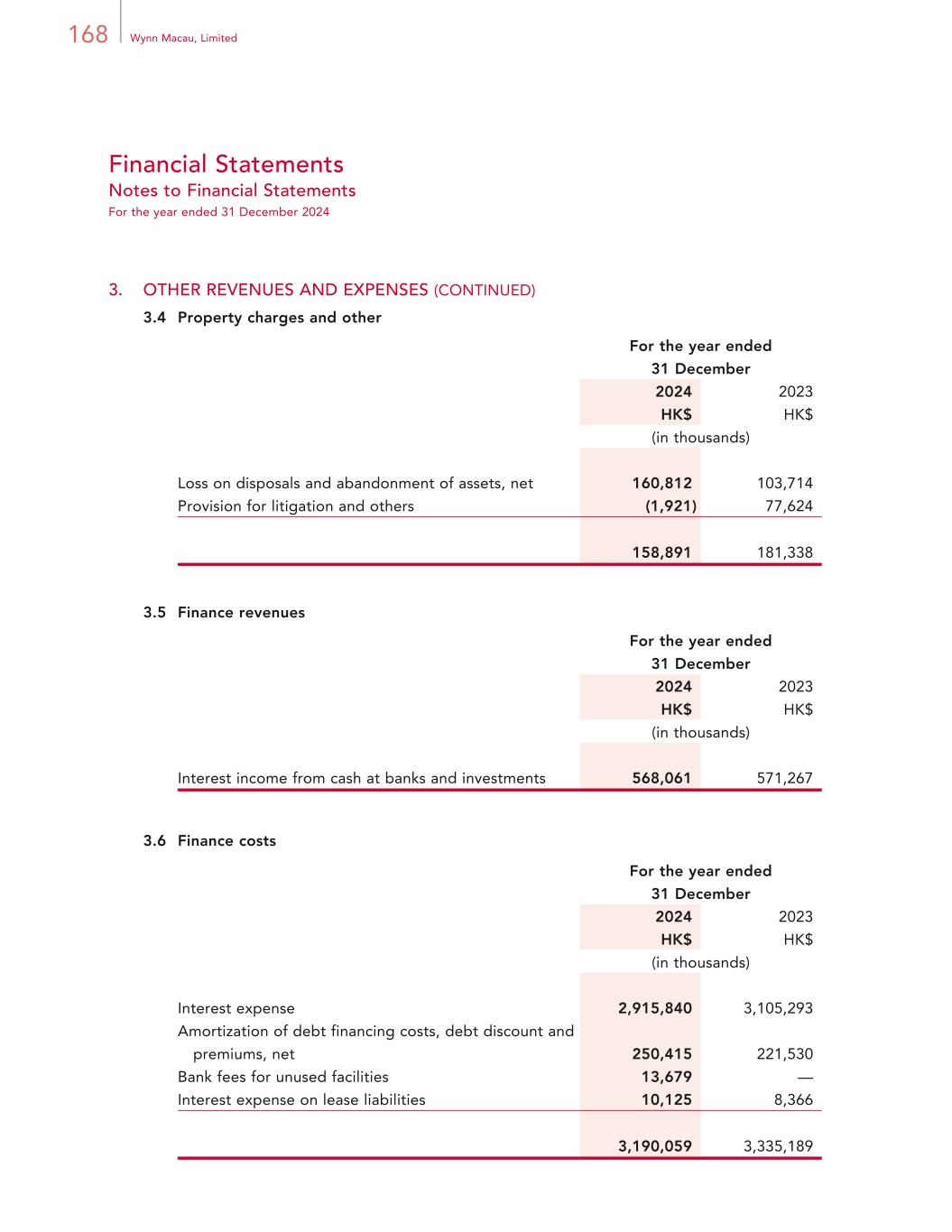 168 Wynn Macau, Limited Financial Statements Notes to Financial Statements For the year ended 31 December 2024 3. OTHER REVENUES AND EXPENSES (CONTINUED) 3.4 Property charges and other For the year ended 31 December 2024 2023 HK$ HK$ (in thousands) Loss on disposals and abandonment of assets, net 160,812 103,714 Provision for litigation and others (1,921) 77,624 158,891 181,338 3.5 Finance revenues For the year ended 31 December 2024 2023 HK$ HK$ (in thousands) Interest income from cash at banks and investments 568,061 571,267 3.6 Finance costs For the year ended 31 December 2024 2023 HK$ HK$ (in thousands) Interest expense 2,915,840 3,105,293 Amortization of debt financing costs, debt discount and premiums, net 250,415 221,530 Bank fees for unused facilities 13,679 — Interest expense on lease liabilities 10,125 8,366 3,190,059 3,335,189