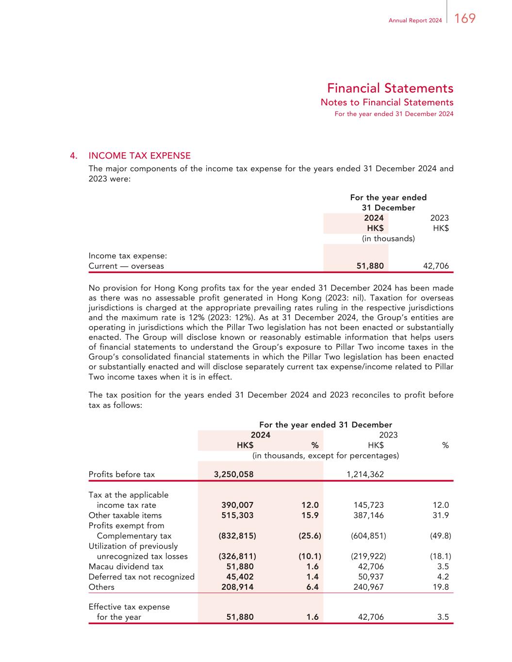 169Annual Report 2024 Financial Statements Notes to Financial Statements For the year ended 31 December 2024 4. INCOME TAX EXPENSE The major components of the income tax expense for the years ended 31 December 2024 and 2023 were: For the year ended 31 December 2024 2023 HK$ HK$ (in thousands) Income tax expense: Current — overseas 51,880 42,706 No provision for Hong Kong profits tax for the year ended 31 December 2024 has been made as there was no assessable profit generated in Hong Kong (2023: nil). Taxation for overseas jurisdictions is charged at the appropriate prevailing rates ruling in the respective jurisdictions and the maximum rate is 12% (2023: 12%). As at 31 December 2024, the Group’s entities are operating in jurisdictions which the Pillar Two legislation has not been enacted or substantially enacted. The Group will disclose known or reasonably estimable information that helps users of financial statements to understand the Group’s exposure to Pillar Two income taxes in the Group’s consolidated financial statements in which the Pillar Two legislation has been enacted or substantially enacted and will disclose separately current tax expense/income related to Pillar Two income taxes when it is in effect. The tax position for the years ended 31 December 2024 and 2023 reconciles to profit before tax as follows: For the year ended 31 December 2024 2023 HK$ % HK$ % (in thousands, except for percentages) Profits before tax 3,250,058 1,214,362 Tax at the applicable income tax rate 390,007 12.0 145,723 12.0 Other taxable items 515,303 15.9 387,146 31.9 Profits exempt from Complementary tax (832,815) (25.6) (604,851) (49.8) Utilization of previously unrecognized tax losses (326,811) (10.1) (219,922) (18.1) Macau dividend tax 51,880 1.6 42,706 3.5 Deferred tax not recognized 45,402 1.4 50,937 4.2 Others 208,914 6.4 240,967 19.8 Effective tax expense for the year 51,880 1.6 42,706 3.5