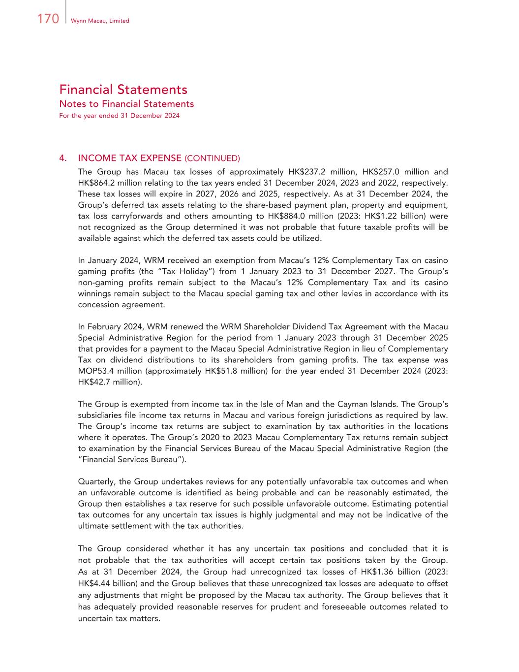 170 Wynn Macau, Limited Financial Statements Notes to Financial Statements For the year ended 31 December 2024 4. INCOME TAX EXPENSE (CONTINUED) The Group has Macau tax losses of approximately HK$237.2 million, HK$257.0 million and HK$864.2 million relating to the tax years ended 31 December 2024, 2023 and 2022, respectively. These tax losses will expire in 2027, 2026 and 2025, respectively. As at 31 December 2024, the Group’s deferred tax assets relating to the share-based payment plan, property and equipment, tax loss carryforwards and others amounting to HK$884.0 million (2023: HK$1.22 billion) were not recognized as the Group determined it was not probable that future taxable profits will be available against which the deferred tax assets could be utilized. In January 2024, WRM received an exemption from Macau’s 12% Complementary Tax on casino gaming profits (the “Tax Holiday”) from 1 January 2023 to 31 December 2027. The Group’s non-gaming profits remain subject to the Macau’s 12% Complementary Tax and its casino winnings remain subject to the Macau special gaming tax and other levies in accordance with its concession agreement. In February 2024, WRM renewed the WRM Shareholder Dividend Tax Agreement with the Macau Special Administrative Region for the period from 1 January 2023 through 31 December 2025 that provides for a payment to the Macau Special Administrative Region in lieu of Complementary Tax on dividend distributions to its shareholders from gaming profits. The tax expense was MOP53.4 million (approximately HK$51.8 million) for the year ended 31 December 2024 (2023: HK$42.7 million). The Group is exempted from income tax in the Isle of Man and the Cayman Islands. The Group’s subsidiaries file income tax returns in Macau and various foreign jurisdictions as required by law. The Group’s income tax returns are subject to examination by tax authorities in the locations where it operates. The Group’s 2020 to 2023 Macau Complementary Tax returns remain subject to examination by the Financial Services Bureau of the Macau Special Administrative Region (the “Financial Services Bureau”). Quarterly, the Group undertakes reviews for any potentially unfavorable tax outcomes and when an unfavorable outcome is identified as being probable and can be reasonably estimated, the Group then establishes a tax reserve for such possible unfavorable outcome. Estimating potential tax outcomes for any uncertain tax issues is highly judgmental and may not be indicative of the ultimate settlement with the tax authorities. The Group considered whether it has any uncertain tax positions and concluded that it is not probable that the tax authorities will accept certain tax positions taken by the Group. As at 31 December 2024, the Group had unrecognized tax losses of HK$1.36 billion (2023: HK$4.44 billion) and the Group believes that these unrecognized tax losses are adequate to offset any adjustments that might be proposed by the Macau tax authority. The Group believes that it has adequately provided reasonable reserves for prudent and foreseeable outcomes related to uncertain tax matters.
