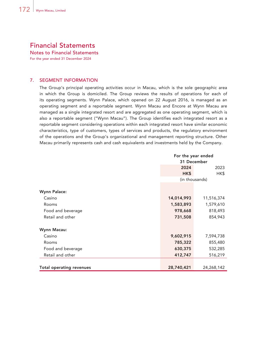 172 Wynn Macau, Limited Financial Statements Notes to Financial Statements For the year ended 31 December 2024 7. SEGMENT INFORMATION The Group’s principal operating activities occur in Macau, which is the sole geographic area in which the Group is domiciled. The Group reviews the results of operations for each of its operating segments. Wynn Palace, which opened on 22 August 2016, is managed as an operating segment and a reportable segment. Wynn Macau and Encore at Wynn Macau are managed as a single integrated resort and are aggregated as one operating segment, which is also a reportable segment (“Wynn Macau”). The Group identifies each integrated resort as a reportable segment considering operations within each integrated resort have similar economic characteristics, type of customers, types of services and products, the regulatory environment of the operations and the Group’s organizational and management reporting structure. Other Macau primarily represents cash and cash equivalents and investments held by the Company. For the year ended 31 December 2024 2023 HK$ HK$ (in thousands) Wynn Palace: Casino 14,014,993 11,516,374 Rooms 1,583,893 1,579,610 Food and beverage 978,668 818,493 Retail and other 731,508 854,943 Wynn Macau: Casino 9,602,915 7,594,738 Rooms 785,322 855,480 Food and beverage 630,375 532,285 Retail and other 412,747 516,219 Total operating revenues 28,740,421 24,268,142