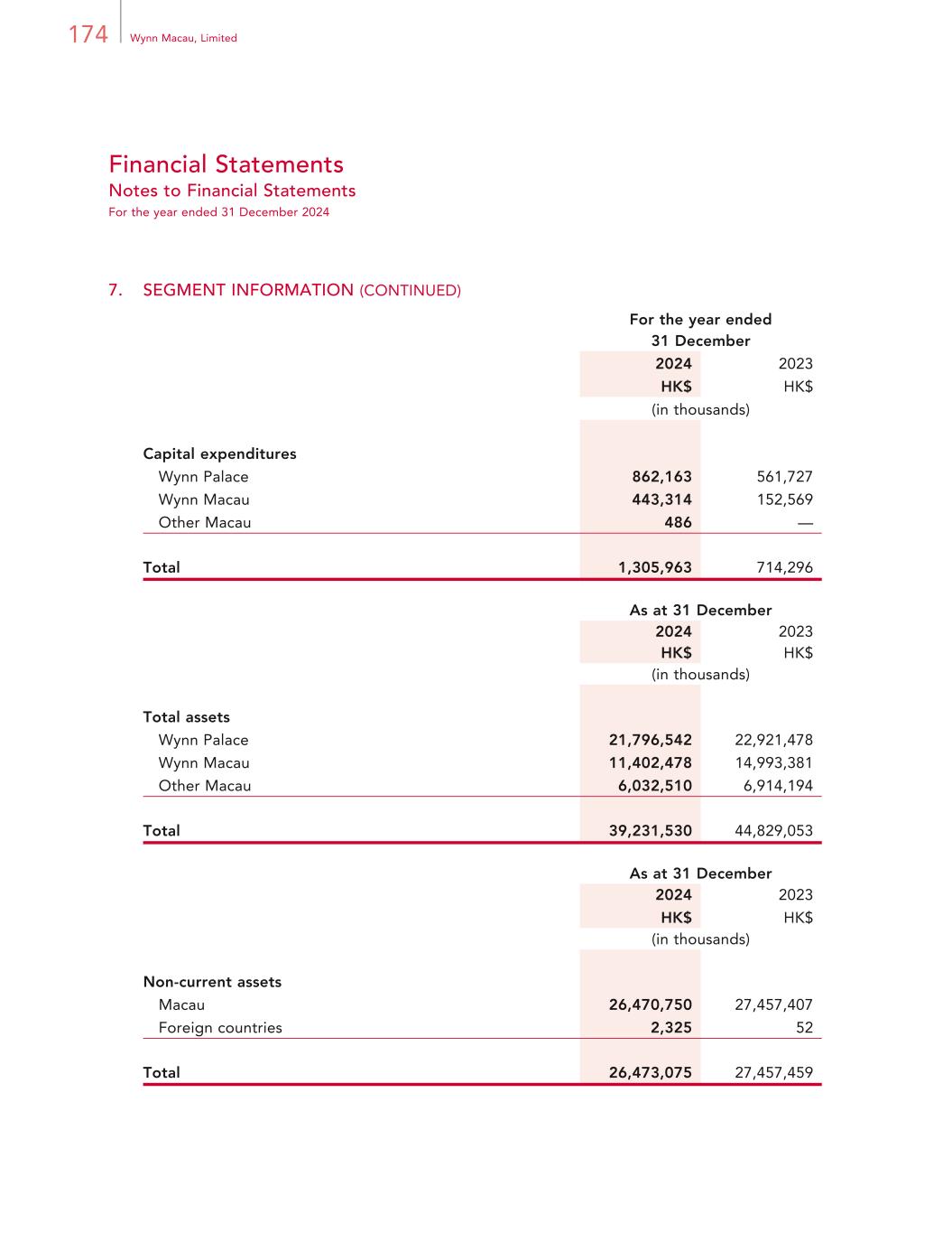 174 Wynn Macau, Limited Financial Statements Notes to Financial Statements For the year ended 31 December 2024 7. SEGMENT INFORMATION (CONTINUED) For the year ended 31 December 2024 2023 HK$ HK$ (in thousands) Capital expenditures Wynn Palace 862,163 561,727 Wynn Macau 443,314 152,569 Other Macau 486 — Total 1,305,963 714,296 As at 31 December 2024 2023 HK$ HK$ (in thousands) Total assets Wynn Palace 21,796,542 22,921,478 Wynn Macau 11,402,478 14,993,381 Other Macau 6,032,510 6,914,194 Total 39,231,530 44,829,053 As at 31 December 2024 2023 HK$ HK$ (in thousands) Non-current assets Macau 26,470,750 27,457,407 Foreign countries 2,325 52 Total 26,473,075 27,457,459