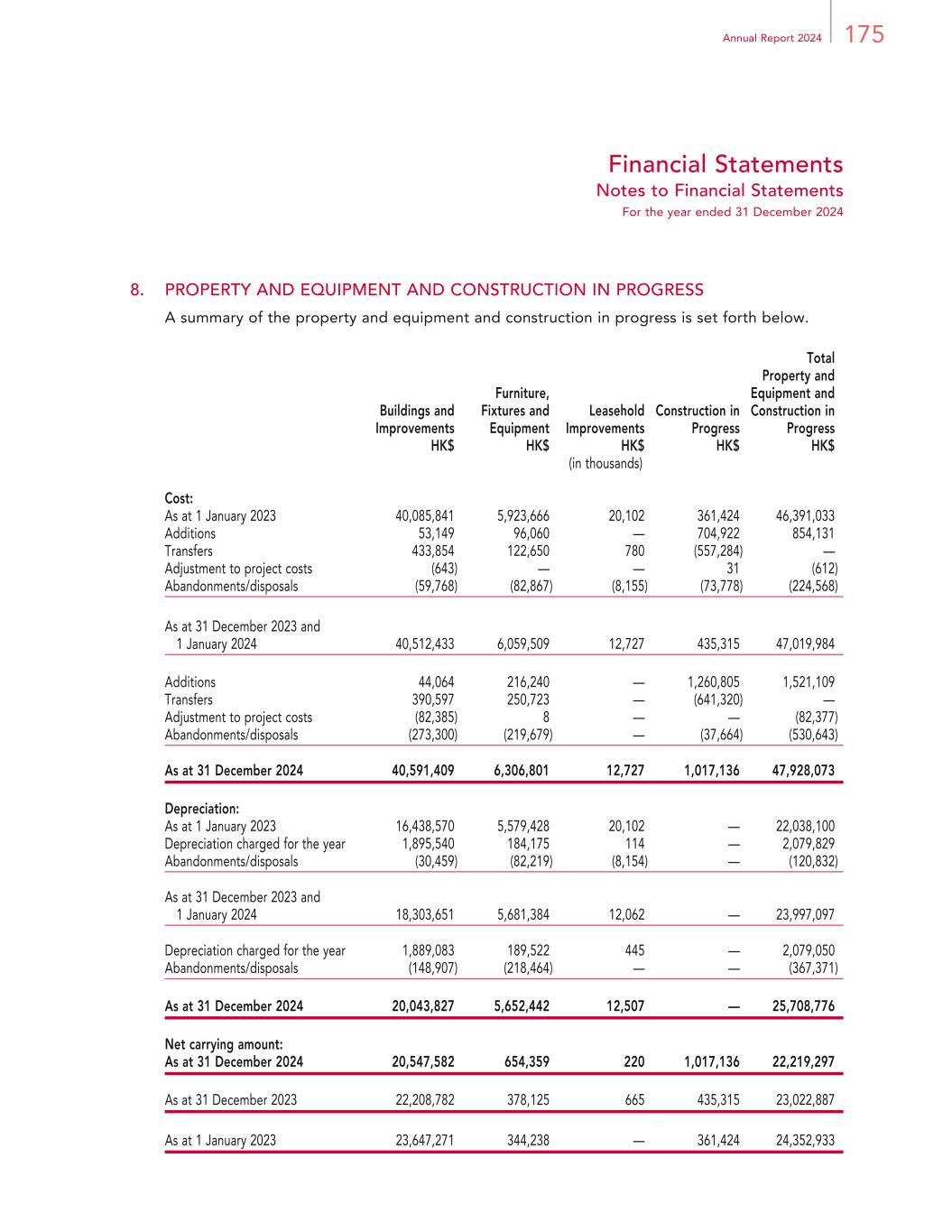 175Annual Report 2024 Financial Statements Notes to Financial Statements For the year ended 31 December 2024 8. PROPERTY AND EQUIPMENT AND CONSTRUCTION IN PROGRESS A summary of the property and equipment and construction in progress is set forth below. Buildings and Improvements Furniture, Fixtures and Equipment Leasehold Improvements Construction in Progress Total Property and Equipment and Construction in Progress HK$ HK$ HK$ HK$ HK$ (in thousands) Cost: As at 1 January 2023 40,085,841 5,923,666 20,102 361,424 46,391,033 Additions 53,149 96,060 — 704,922 854,131 Transfers 433,854 122,650 780 (557,284) — Adjustment to project costs (643) — — 31 (612) Abandonments/disposals (59,768) (82,867) (8,155) (73,778) (224,568) As at 31 December 2023 and 1 January 2024 40,512,433 6,059,509 12,727 435,315 47,019,984 Additions 44,064 216,240 — 1,260,805 1,521,109 Transfers 390,597 250,723 — (641,320) — Adjustment to project costs (82,385) 8 — — (82,377) Abandonments/disposals (273,300) (219,679) — (37,664) (530,643) As at 31 December 2024 40,591,409 6,306,801 12,727 1,017,136 47,928,073 Depreciation: As at 1 January 2023 16,438,570 5,579,428 20,102 — 22,038,100 Depreciation charged for the year 1,895,540 184,175 114 — 2,079,829 Abandonments/disposals (30,459) (82,219) (8,154) — (120,832) As at 31 December 2023 and 1 January 2024 18,303,651 5,681,384 12,062 — 23,997,097 Depreciation charged for the year 1,889,083 189,522 445 — 2,079,050 Abandonments/disposals (148,907) (218,464) — — (367,371) As at 31 December 2024 20,043,827 5,652,442 12,507 — 25,708,776 Net carrying amount: As at 31 December 2024 20,547,582 654,359 220 1,017,136 22,219,297 As at 31 December 2023 22,208,782 378,125 665 435,315 23,022,887 As at 1 January 2023 23,647,271 344,238 — 361,424 24,352,933