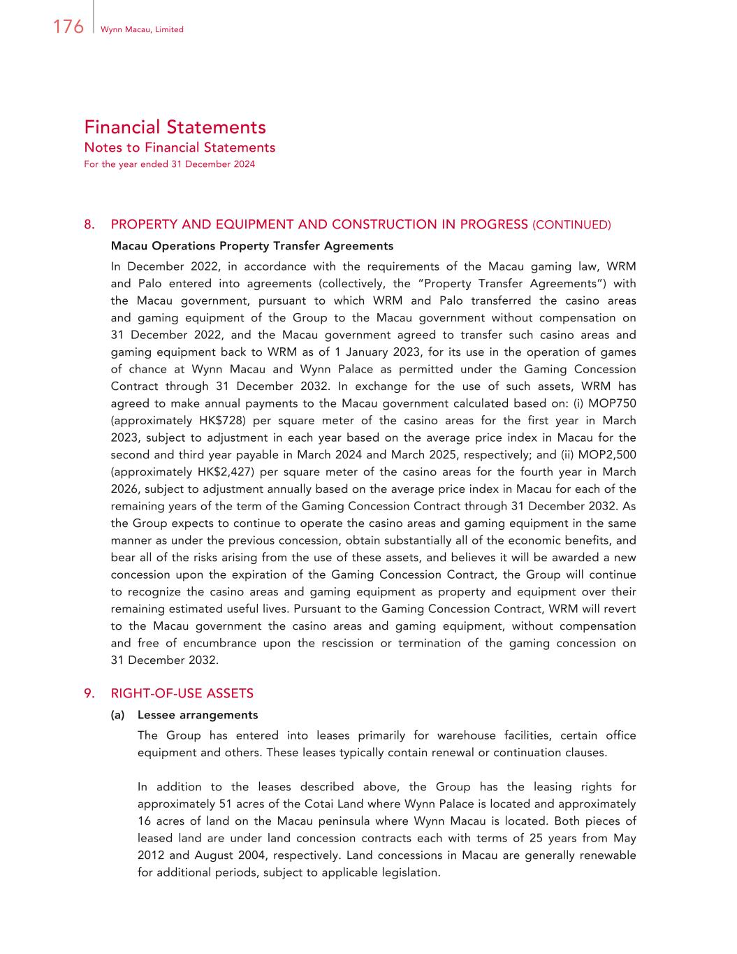 176 Wynn Macau, Limited Financial Statements Notes to Financial Statements For the year ended 31 December 2024 8. PROPERTY AND EQUIPMENT AND CONSTRUCTION IN PROGRESS (CONTINUED) Macau Operations Property Transfer Agreements In December 2022, in accordance with the requirements of the Macau gaming law, WRM and Palo entered into agreements (collectively, the “Property Transfer Agreements”) with the Macau government, pursuant to which WRM and Palo transferred the casino areas and gaming equipment of the Group to the Macau government without compensation on 31 December 2022, and the Macau government agreed to transfer such casino areas and gaming equipment back to WRM as of 1 January 2023, for its use in the operation of games of chance at Wynn Macau and Wynn Palace as permitted under the Gaming Concession Contract through 31 December 2032. In exchange for the use of such assets, WRM has agreed to make annual payments to the Macau government calculated based on: (i) MOP750 (approximately HK$728) per square meter of the casino areas for the first year in March 2023, subject to adjustment in each year based on the average price index in Macau for the second and third year payable in March 2024 and March 2025, respectively; and (ii) MOP2,500 (approximately HK$2,427) per square meter of the casino areas for the fourth year in March 2026, subject to adjustment annually based on the average price index in Macau for each of the remaining years of the term of the Gaming Concession Contract through 31 December 2032. As the Group expects to continue to operate the casino areas and gaming equipment in the same manner as under the previous concession, obtain substantially all of the economic benefits, and bear all of the risks arising from the use of these assets, and believes it will be awarded a new concession upon the expiration of the Gaming Concession Contract, the Group will continue to recognize the casino areas and gaming equipment as property and equipment over their remaining estimated useful lives. Pursuant to the Gaming Concession Contract, WRM will revert to the Macau government the casino areas and gaming equipment, without compensation and free of encumbrance upon the rescission or termination of the gaming concession on 31 December 2032. 9. RIGHT-OF-USE ASSETS (a) Lessee arrangements The Group has entered into leases primarily for warehouse facilities, certain office equipment and others. These leases typically contain renewal or continuation clauses. In addition to the leases described above, the Group has the leasing rights for approximately 51 acres of the Cotai Land where Wynn Palace is located and approximately 16 acres of land on the Macau peninsula where Wynn Macau is located. Both pieces of leased land are under land concession contracts each with terms of 25 years from May 2012 and August 2004, respectively. Land concessions in Macau are generally renewable for additional periods, subject to applicable legislation.