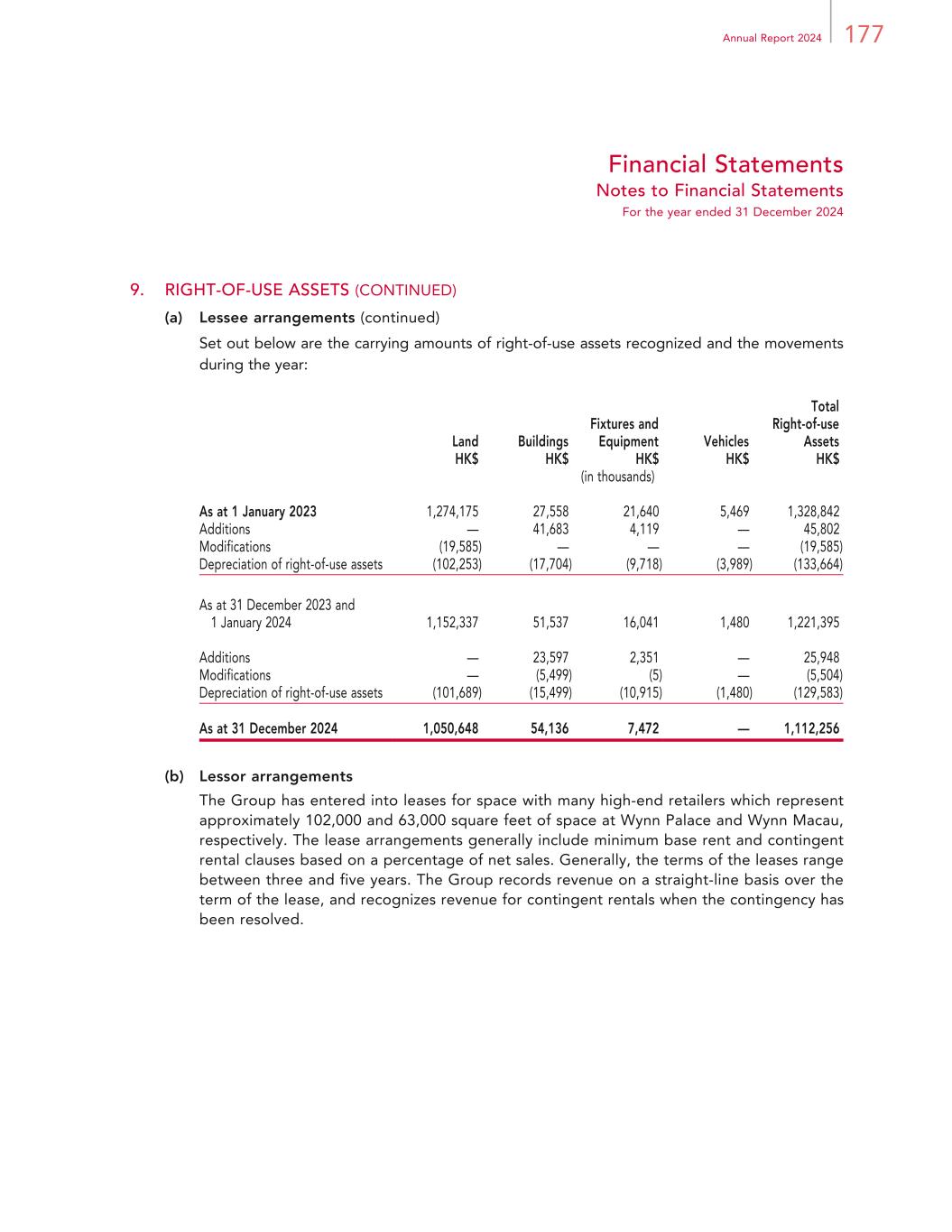 177Annual Report 2024 Financial Statements Notes to Financial Statements For the year ended 31 December 2024 9. RIGHT-OF-USE ASSETS (CONTINUED) (a) Lessee arrangements (continued) Set out below are the carrying amounts of right-of-use assets recognized and the movements during the year: Land Buildings Fixtures and Equipment Vehicles Total Right-of-use Assets HK$ HK$ HK$ HK$ HK$ (in thousands) As at 1 January 2023 1,274,175 27,558 21,640 5,469 1,328,842 Additions — 41,683 4,119 — 45,802 Modifications (19,585) — — — (19,585) Depreciation of right-of-use assets (102,253) (17,704) (9,718) (3,989) (133,664) As at 31 December 2023 and 1 January 2024 1,152,337 51,537 16,041 1,480 1,221,395 Additions — 23,597 2,351 — 25,948 Modifications — (5,499) (5) — (5,504) Depreciation of right-of-use assets (101,689) (15,499) (10,915) (1,480) (129,583) As at 31 December 2024 1,050,648 54,136 7,472 — 1,112,256 (b) Lessor arrangements The Group has entered into leases for space with many high-end retailers which represent approximately 102,000 and 63,000 square feet of space at Wynn Palace and Wynn Macau, respectively. The lease arrangements generally include minimum base rent and contingent rental clauses based on a percentage of net sales. Generally, the terms of the leases range between three and five years. The Group records revenue on a straight-line basis over the term of the lease, and recognizes revenue for contingent rentals when the contingency has been resolved.