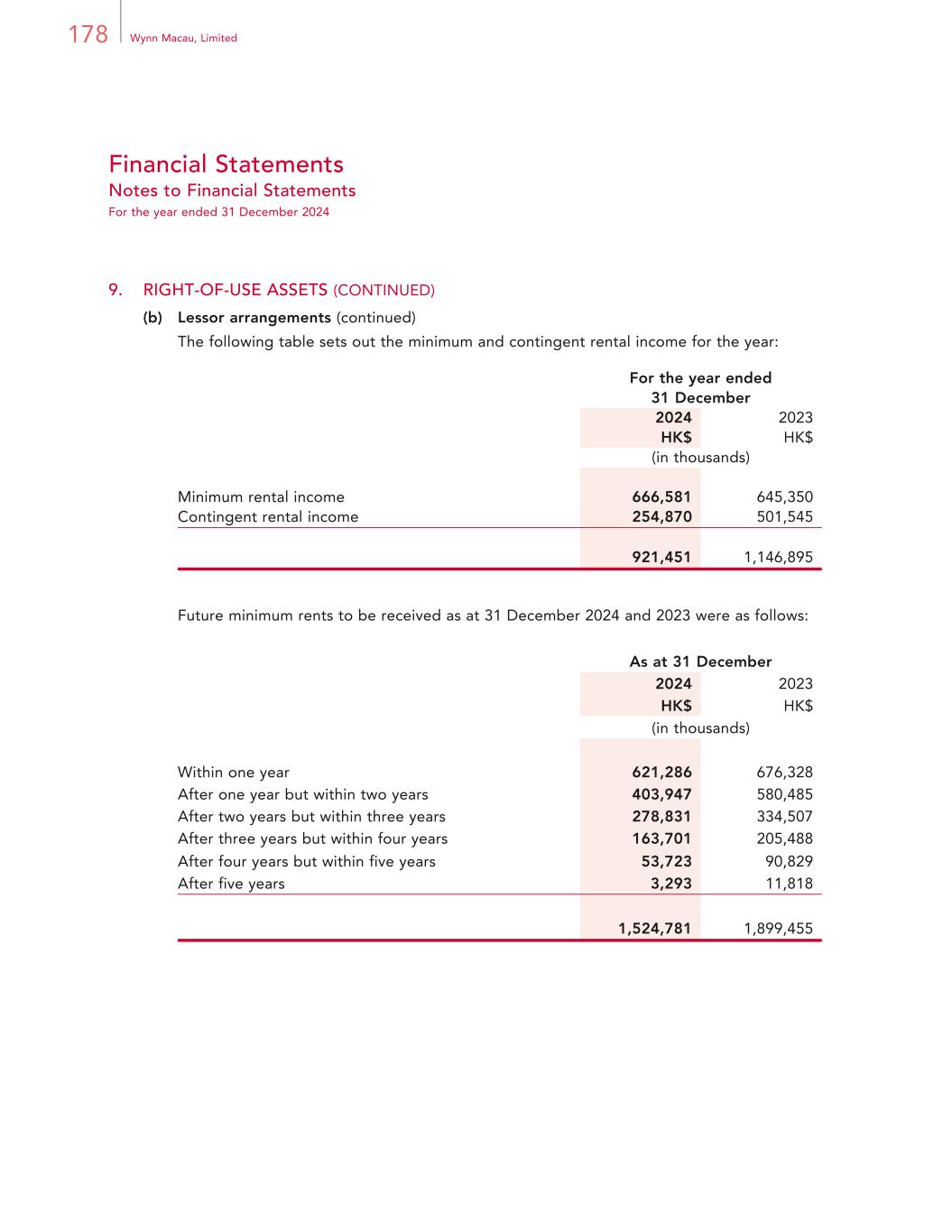 178 Wynn Macau, Limited Financial Statements Notes to Financial Statements For the year ended 31 December 2024 9. RIGHT-OF-USE ASSETS (CONTINUED) (b) Lessor arrangements (continued) The following table sets out the minimum and contingent rental income for the year: For the year ended 31 December 2024 2023 HK$ HK$ (in thousands) Minimum rental income 666,581 645,350 Contingent rental income 254,870 501,545 921,451 1,146,895 Future minimum rents to be received as at 31 December 2024 and 2023 were as follows: As at 31 December 2024 2023 HK$ HK$ (in thousands) Within one year 621,286 676,328 After one year but within two years 403,947 580,485 After two years but within three years 278,831 334,507 After three years but within four years 163,701 205,488 After four years but within five years 53,723 90,829 After five years 3,293 11,818 1,524,781 1,899,455