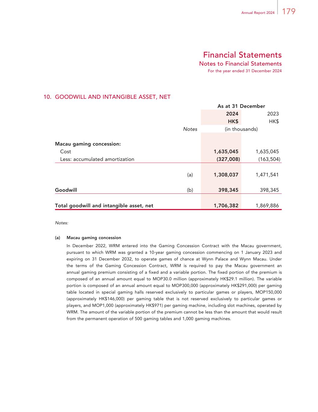 179Annual Report 2024 Financial Statements Notes to Financial Statements For the year ended 31 December 2024 10. GOODWILL AND INTANGIBLE ASSET, NET As at 31 December 2024 2023 HK$ HK$ Notes (in thousands) Macau gaming concession: Cost 1,635,045 1,635,045 Less: accumulated amortization (327,008) (163,504) (a) 1,308,037 1,471,541 Goodwill (b) 398,345 398,345 Total goodwill and intangible asset, net 1,706,382 1,869,886 Notes: (a) Macau gaming concession In December 2022, WRM entered into the Gaming Concession Contract with the Macau government, pursuant to which WRM was granted a 10-year gaming concession commencing on 1 January 2023 and expiring on 31 December 2032, to operate games of chance at Wynn Palace and Wynn Macau. Under the terms of the Gaming Concession Contract, WRM is required to pay the Macau government an annual gaming premium consisting of a fixed and a variable portion. The fixed portion of the premium is composed of an annual amount equal to MOP30.0 million (approximately HK$29.1 million). The variable portion is composed of an annual amount equal to MOP300,000 (approximately HK$291,000) per gaming table located in special gaming halls reserved exclusively to particular games or players, MOP150,000 (approximately HK$146,000) per gaming table that is not reserved exclusively to particular games or players, and MOP1,000 (approximately HK$971) per gaming machine, including slot machines, operated by WRM. The amount of the variable portion of the premium cannot be less than the amount that would result from the permanent operation of 500 gaming tables and 1,000 gaming machines.