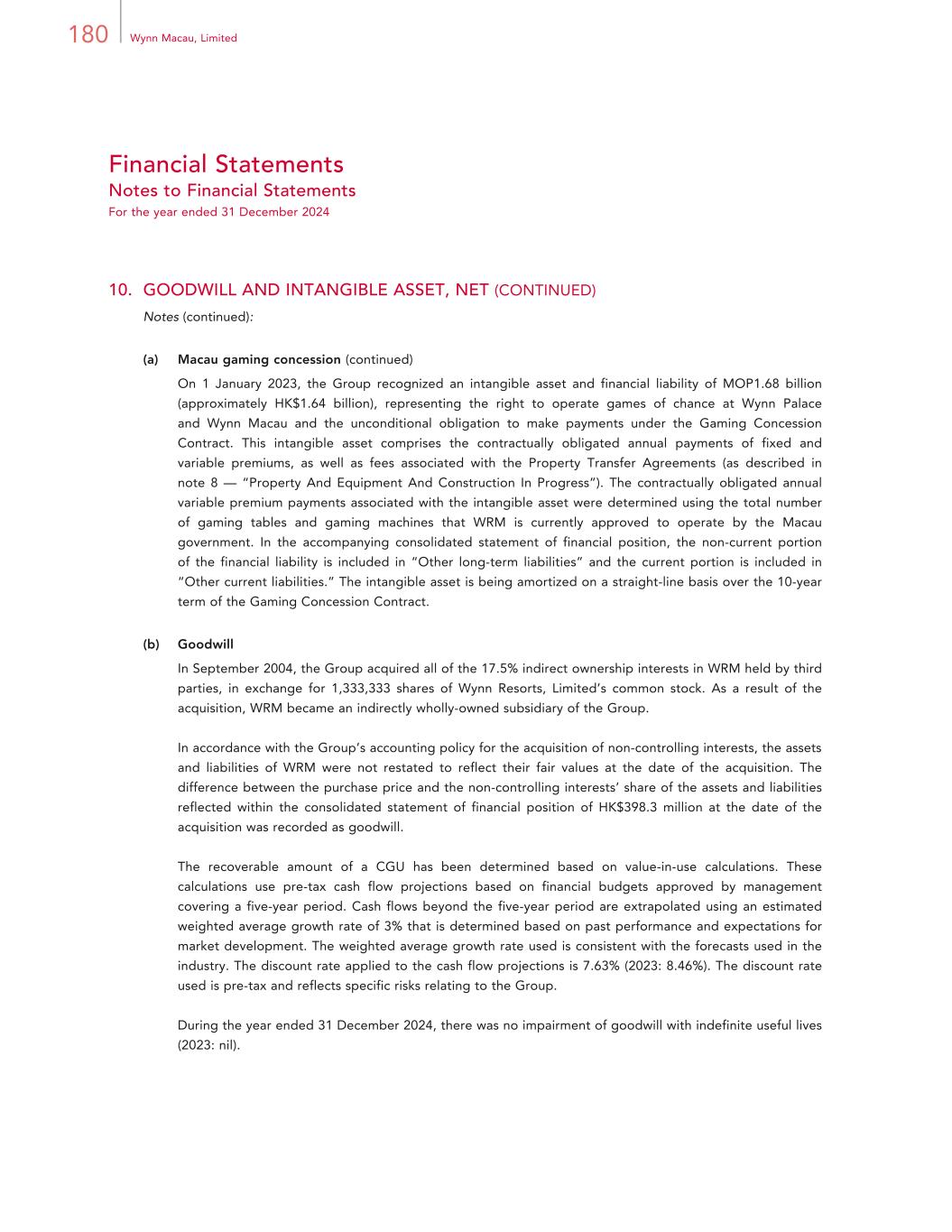 180 Wynn Macau, Limited Financial Statements Notes to Financial Statements For the year ended 31 December 2024 10. GOODWILL AND INTANGIBLE ASSET, NET (CONTINUED) Notes (continued): (a) Macau gaming concession (continued) On 1 January 2023, the Group recognized an intangible asset and financial liability of MOP1.68 billion (approximately HK$1.64 billion), representing the right to operate games of chance at Wynn Palace and Wynn Macau and the unconditional obligation to make payments under the Gaming Concession Contract. This intangible asset comprises the contractually obligated annual payments of fixed and variable premiums, as well as fees associated with the Property Transfer Agreements (as described in note 8 — “Property And Equipment And Construction In Progress”). The contractually obligated annual variable premium payments associated with the intangible asset were determined using the total number of gaming tables and gaming machines that WRM is currently approved to operate by the Macau government. In the accompanying consolidated statement of financial position, the non-current portion of the financial liability is included in “Other long-term liabilities” and the current portion is included in “Other current liabilities.” The intangible asset is being amortized on a straight-line basis over the 10-year term of the Gaming Concession Contract. (b) Goodwill In September 2004, the Group acquired all of the 17.5% indirect ownership interests in WRM held by third parties, in exchange for 1,333,333 shares of Wynn Resorts, Limited’s common stock. As a result of the acquisition, WRM became an indirectly wholly-owned subsidiary of the Group. In accordance with the Group’s accounting policy for the acquisition of non-controlling interests, the assets and liabilities of WRM were not restated to reflect their fair values at the date of the acquisition. The difference between the purchase price and the non-controlling interests’ share of the assets and liabilities reflected within the consolidated statement of financial position of HK$398.3 million at the date of the acquisition was recorded as goodwill. The recoverable amount of a CGU has been determined based on value-in-use calculations. These calculations use pre-tax cash flow projections based on financial budgets approved by management covering a five-year period. Cash flows beyond the five-year period are extrapolated using an estimated weighted average growth rate of 3% that is determined based on past performance and expectations for market development. The weighted average growth rate used is consistent with the forecasts used in the industry. The discount rate applied to the cash flow projections is 7.63% (2023: 8.46%). The discount rate used is pre-tax and reflects specific risks relating to the Group. During the year ended 31 December 2024, there was no impairment of goodwill with indefinite useful lives (2023: nil).
