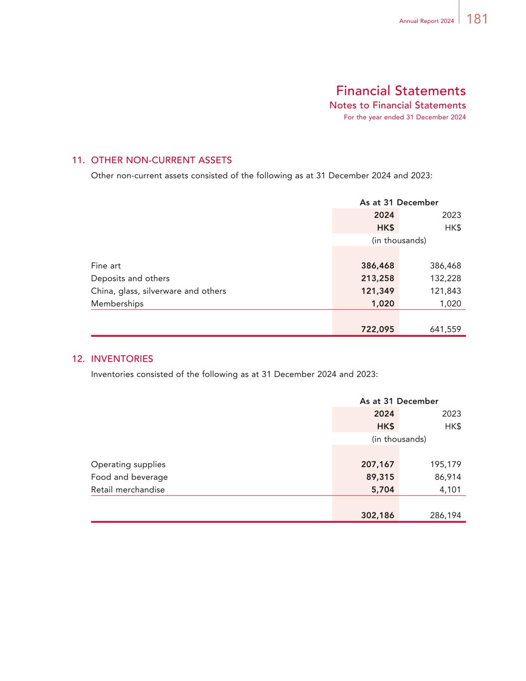 181Annual Report 2024 Financial Statements Notes to Financial Statements For the year ended 31 December 2024 11. OTHER NON-CURRENT ASSETS Other non-current assets consisted of the following as at 31 December 2024 and 2023: As at 31 December 2024 2023 HK$ HK$ (in thousands) Fine art 386,468 386,468 Deposits and others 213,258 132,228 China, glass, silverware and others 121,349 121,843 Memberships 1,020 1,020 722,095 641,559 12. INVENTORIES Inventories consisted of the following as at 31 December 2024 and 2023: As at 31 December 2024 2023 HK$ HK$ (in thousands) Operating supplies 207,167 195,179 Food and beverage 89,315 86,914 Retail merchandise 5,704 4,101 302,186 286,194