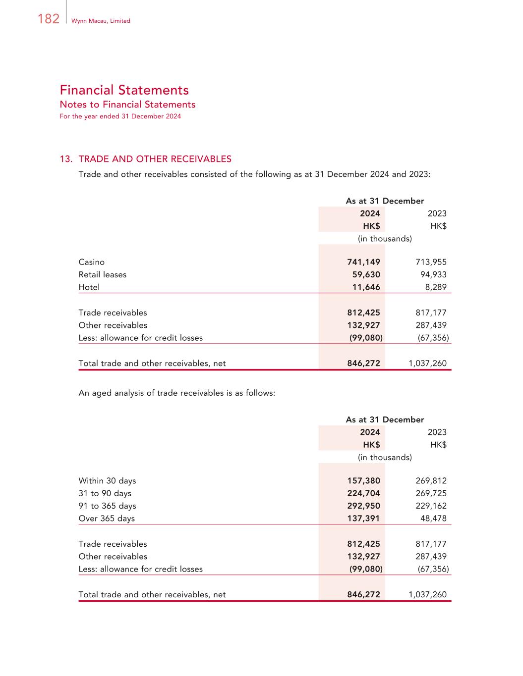 182 Wynn Macau, Limited Financial Statements Notes to Financial Statements For the year ended 31 December 2024 13. TRADE AND OTHER RECEIVABLES Trade and other receivables consisted of the following as at 31 December 2024 and 2023: As at 31 December 2024 2023 HK$ HK$ (in thousands) Casino 741,149 713,955 Retail leases 59,630 94,933 Hotel 11,646 8,289 Trade receivables 812,425 817,177 Other receivables 132,927 287,439 Less: allowance for credit losses (99,080) (67,356) Total trade and other receivables, net 846,272 1,037,260 An aged analysis of trade receivables is as follows: As at 31 December 2024 2023 HK$ HK$ (in thousands) Within 30 days 157,380 269,812 31 to 90 days 224,704 269,725 91 to 365 days 292,950 229,162 Over 365 days 137,391 48,478 Trade receivables 812,425 817,177 Other receivables 132,927 287,439 Less: allowance for credit losses (99,080) (67,356) Total trade and other receivables, net 846,272 1,037,260