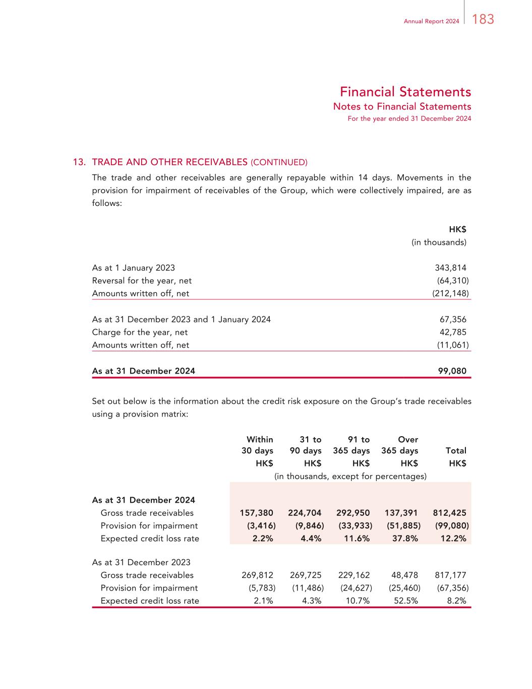 183Annual Report 2024 Financial Statements Notes to Financial Statements For the year ended 31 December 2024 13. TRADE AND OTHER RECEIVABLES (CONTINUED) The trade and other receivables are generally repayable within 14 days. Movements in the provision for impairment of receivables of the Group, which were collectively impaired, are as follows: HK$ (in thousands) As at 1 January 2023 343,814 Reversal for the year, net (64,310) Amounts written off, net (212,148) As at 31 December 2023 and 1 January 2024 67,356 Charge for the year, net 42,785 Amounts written off, net (11,061) As at 31 December 2024 99,080 Set out below is the information about the credit risk exposure on the Group’s trade receivables using a provision matrix: Within 30 days 31 to 90 days 91 to 365 days Over 365 days Total HK$ HK$ HK$ HK$ HK$ (in thousands, except for percentages) As at 31 December 2024 Gross trade receivables 157,380 224,704 292,950 137,391 812,425 Provision for impairment (3,416) (9,846) (33,933) (51,885) (99,080) Expected credit loss rate 2.2% 4.4% 11.6% 37.8% 12.2% As at 31 December 2023 Gross trade receivables 269,812 269,725 229,162 48,478 817,177 Provision for impairment (5,783) (11,486) (24,627) (25,460) (67,356) Expected credit loss rate 2.1% 4.3% 10.7% 52.5% 8.2%
