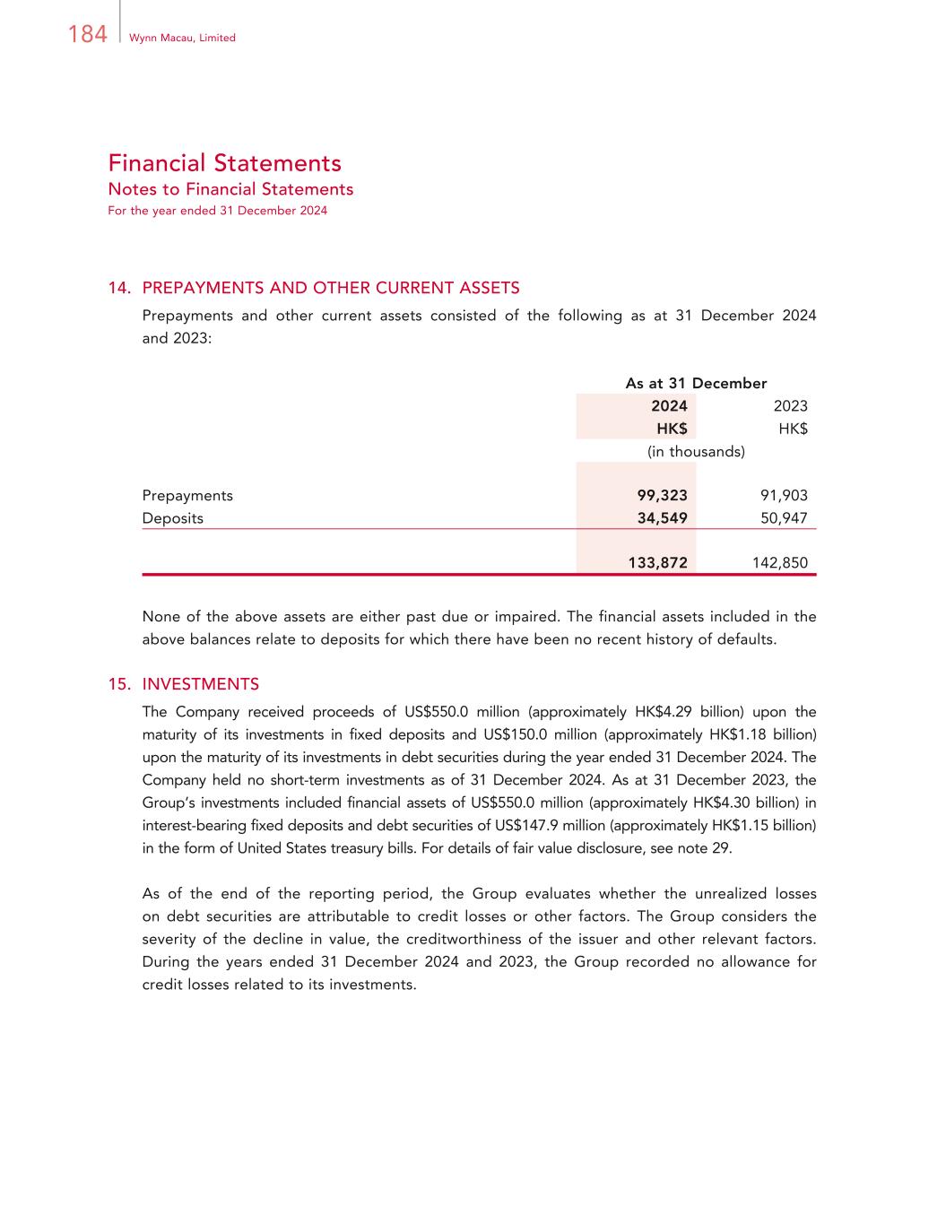 184 Wynn Macau, Limited Financial Statements Notes to Financial Statements For the year ended 31 December 2024 14. PREPAYMENTS AND OTHER CURRENT ASSETS Prepayments and other current assets consisted of the following as at 31 December 2024 and 2023: As at 31 December 2024 2023 HK$ HK$ (in thousands) Prepayments 99,323 91,903 Deposits 34,549 50,947 133,872 142,850 None of the above assets are either past due or impaired. The financial assets included in the above balances relate to deposits for which there have been no recent history of defaults. 15. INVESTMENTS The Company received proceeds of US$550.0 million (approximately HK$4.29 billion) upon the maturity of its investments in fixed deposits and US$150.0 million (approximately HK$1.18 billion) upon the maturity of its investments in debt securities during the year ended 31 December 2024. The Company held no short-term investments as of 31 December 2024. As at 31 December 2023, the Group’s investments included financial assets of US$550.0 million (approximately HK$4.30 billion) in interest-bearing fixed deposits and debt securities of US$147.9 million (approximately HK$1.15 billion) in the form of United States treasury bills. For details of fair value disclosure, see note 29. As of the end of the reporting period, the Group evaluates whether the unrealized losses on debt securities are attributable to credit losses or other factors. The Group considers the severity of the decline in value, the creditworthiness of the issuer and other relevant factors. During the years ended 31 December 2024 and 2023, the Group recorded no allowance for credit losses related to its investments.