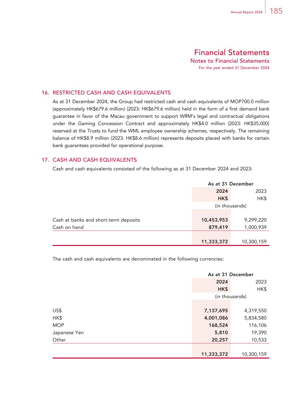 185Annual Report 2024 Financial Statements Notes to Financial Statements For the year ended 31 December 2024 16. RESTRICTED CASH AND CASH EQUIVALENTS As at 31 December 2024, the Group had restricted cash and cash equivalents of MOP700.0 million (approximately HK$679.6 million) (2023: HK$679.6 million) held in the form of a first demand bank guarantee in favor of the Macau government to support WRM’s legal and contractual obligations under the Gaming Concession Contract and approximately HK$4.0 million (2023: HK$35,000) reserved at the Trusts to fund the WML employee ownership schemes, respectively. The remaining balance of HK$8.9 million (2023: HK$8.6 million) represents deposits placed with banks for certain bank guarantees provided for operational purpose. 17. CASH AND CASH EQUIVALENTS Cash and cash equivalents consisted of the following as at 31 December 2024 and 2023: As at 31 December 2024 2023 HK$ HK$ (in thousands) Cash at banks and short-term deposits 10,453,953 9,299,220 Cash on hand 879,419 1,000,939 11,333,372 10,300,159 The cash and cash equivalents are denominated in the following currencies: As at 31 December 2024 2023 HK$ HK$ (in thousands) US$ 7,137,695 4,319,550 HK$ 4,001,086 5,834,580 MOP 168,524 116,106 Japanese Yen 5,810 19,390 Other 20,257 10,533 11,333,372 10,300,159