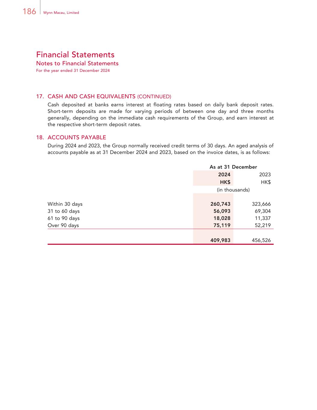 186 Wynn Macau, Limited Financial Statements Notes to Financial Statements For the year ended 31 December 2024 17. CASH AND CASH EQUIVALENTS (CONTINUED) Cash deposited at banks earns interest at floating rates based on daily bank deposit rates. Short-term deposits are made for varying periods of between one day and three months generally, depending on the immediate cash requirements of the Group, and earn interest at the respective short-term deposit rates. 18. ACCOUNTS PAYABLE During 2024 and 2023, the Group normally received credit terms of 30 days. An aged analysis of accounts payable as at 31 December 2024 and 2023, based on the invoice dates, is as follows: As at 31 December 2024 2023 HK$ HK$ (in thousands) Within 30 days 260,743 323,666 31 to 60 days 56,093 69,304 61 to 90 days 18,028 11,337 Over 90 days 75,119 52,219 409,983 456,526
