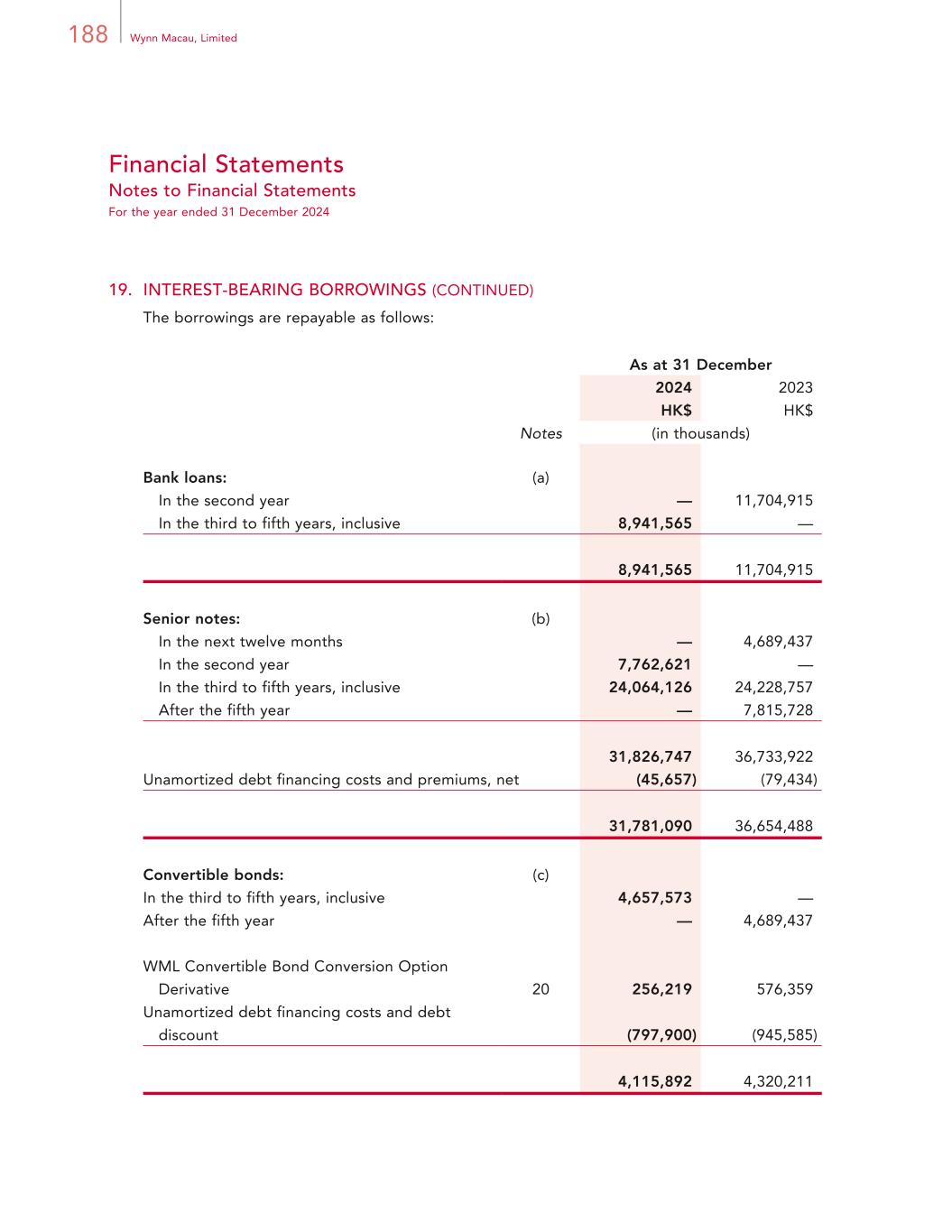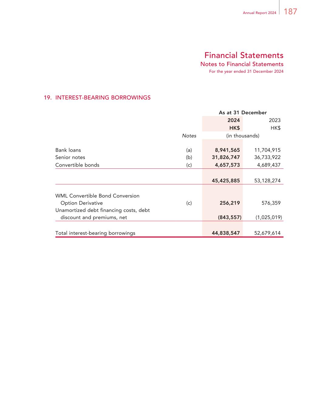 187Annual Report 2024 Financial Statements Notes to Financial Statements For the year ended 31 December 2024 19. INTEREST-BEARING BORROWINGS As at 31 December 2024 2023 HK$ HK$ Notes (in thousands) Bank loans (a) 8,941,565 11,704,915 Senior notes (b) 31,826,747 36,733,922 Convertible bonds (c) 4,657,573 4,689,437 45,425,885 53,128,274 WML Convertible Bond Conversion Option Derivative (c) 256,219 576,359 Unamortized debt financing costs, debt discount and premiums, net (843,557) (1,025,019) Total interest-bearing borrowings 44,838,547 52,679,614