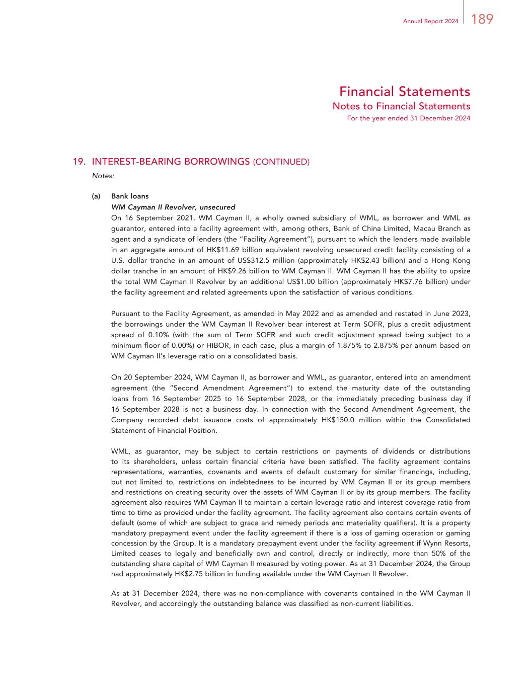 189Annual Report 2024 Financial Statements Notes to Financial Statements For the year ended 31 December 2024 19. INTEREST-BEARING BORROWINGS (CONTINUED) Notes: (a) Bank loans WM Cayman II Revolver, unsecured On 16 September 2021, WM Cayman II, a wholly owned subsidiary of WML, as borrower and WML as guarantor, entered into a facility agreement with, among others, Bank of China Limited, Macau Branch as agent and a syndicate of lenders (the “Facility Agreement”), pursuant to which the lenders made available in an aggregate amount of HK$11.69 billion equivalent revolving unsecured credit facility consisting of a U.S. dollar tranche in an amount of US$312.5 million (approximately HK$2.43 billion) and a Hong Kong dollar tranche in an amount of HK$9.26 billion to WM Cayman II. WM Cayman II has the ability to upsize the total WM Cayman II Revolver by an additional US$1.00 billion (approximately HK$7.76 billion) under the facility agreement and related agreements upon the satisfaction of various conditions. Pursuant to the Facility Agreement, as amended in May 2022 and as amended and restated in June 2023, the borrowings under the WM Cayman II Revolver bear interest at Term SOFR, plus a credit adjustment spread of 0.10% (with the sum of Term SOFR and such credit adjustment spread being subject to a minimum floor of 0.00%) or HIBOR, in each case, plus a margin of 1.875% to 2.875% per annum based on WM Cayman II’s leverage ratio on a consolidated basis. On 20 September 2024, WM Cayman II, as borrower and WML, as guarantor, entered into an amendment agreement (the “Second Amendment Agreement”) to extend the maturity date of the outstanding loans from 16 September 2025 to 16 September 2028, or the immediately preceding business day if 16 September 2028 is not a business day. In connection with the Second Amendment Agreement, the Company recorded debt issuance costs of approximately HK$150.0 million within the Consolidated Statement of Financial Position. WML, as guarantor, may be subject to certain restrictions on payments of dividends or distributions to its shareholders, unless certain financial criteria have been satisfied. The facility agreement contains representations, warranties, covenants and events of default customary for similar financings, including, but not limited to, restrictions on indebtedness to be incurred by WM Cayman II or its group members and restrictions on creating security over the assets of WM Cayman II or by its group members. The facility agreement also requires WM Cayman II to maintain a certain leverage ratio and interest coverage ratio from time to time as provided under the facility agreement. The facility agreement also contains certain events of default (some of which are subject to grace and remedy periods and materiality qualifiers). It is a property mandatory prepayment event under the facility agreement if there is a loss of gaming operation or gaming concession by the Group. It is a mandatory prepayment event under the facility agreement if Wynn Resorts, Limited ceases to legally and beneficially own and control, directly or indirectly, more than 50% of the outstanding share capital of WM Cayman II measured by voting power. As at 31 December 2024, the Group had approximately HK$2.75 billion in funding available under the WM Cayman II Revolver. As at 31 December 2024, there was no non-compliance with covenants contained in the WM Cayman II Revolver, and accordingly the outstanding balance was classified as non-current liabilities.
